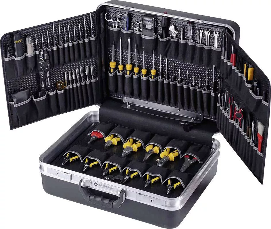 Szállítás tartalma: Beállító csavarhúzó, a penge 40 x 3 mm,Beállító csavarhúzó, a penge 130 x 2 mm,Beállító csavarhúzó, a penge 130 x 3,5 mm,Műszerész tükör nyéllel, teljes egészében BERNSTEINIT-ből,IC kiforrasztó, részben bevágott, műanyag nyéllel,Ónvágó kés műanyag nyéllel, 115 mm,Ónvágó kés műanyag nyéllel, 115 mm,Rugós horog, nikkelezett, szigetelt, 175 mm,Szerszámtartó, sárgaréz nikkelezett, kétoldalt befogópatronokkal szerszám befogáshoz 0-tól 3 mm Ø-ig,Karmos fogó 3 fogó karommal, nyílás max. 12 mm-ig, csíptetővel,Mágnes rúd kettős gömbcsuklóval, billenthető, 215 mm,Üvegszálas kontakttisztító ,2 mérőcsúcs, piros és fekete, különösen vékony, hegyes és hajlékony, a penge 1 mm-es acélhuzalból készült,Kézi nagyító világítással,IC csipesz, nikkelezett, 125 mm-es, IC-k megfogásához, behelyezéséhez és kiemeléséhez,PLCC húzó szerszám,Slimline 115 mm-es oldalcsípő fogó, csak 1,0 mm-es, puha huzalokhoz, rendkívül keskeny fej, átmenő csukló, nyomórugó, krómozott, átlátszó szigeteléssel,Oldalcsípő, 130 mm, kemény huzalhoz, krómozott, BERNSTEINIT szigeteléssel,Telefonfogó, 160 mm, krómozott, BERNSTEINIT szigeteléssel,Lapos fogó, 130 mm, keskeny, átmenő csukló, nyomórugó, krómozott, átlátszó szigeteléssel,Hosszúcsőrű fogó, 130 mm, keskeny, átmenő csukló, nyomórugó, krómozott, átlátszó szigeteléssel,Hosszúcsőrű fogó, 140 mm, keskeny, hajlított, átmenő csukló, nyomórugó, krómozott, átlátszó szigeteléssel,Vízpumpa fogó, 130 mm, krómozott,Kombinált fogó, 165 mm, krómozott, BERNSTEINIT szigeteléssel,Szerelő fogó, rögzítő gyűrűköz 1,5 mm-től 2,8 mm-ig, 140 mm, barnított, állítócsavarral,Huzalcsupaszító fogó, 155 mm, krómozott, BERNSTEINIT szigeteléssel,Érvég hüvely préselő fogó 0,25-től 2,5 mm-ig,Kábelsaru fogó szigetelt és szigeteletlen 230 mm-es kábelsarukhoz,Csavarhúzó a DIN 5265 szerint, speciális 4 szögletűBERNSTEIN nyél, a penge króm-vanádium, krómozott, fekete heggyel, 100 x 4,0 mm,Az előzőhöz hasonló VDE csavarhúzó, a penge 125 x 5,5 mm,Elektronikai csavarhúzó speciális nyéllel és forgatható központosító fejjel, a penge króm-vanádium, krómozott, fekete heggyel, a penge 40 x 1 mm,Az előzőhöz hasonló elektronikai csavarhúzó, a penge 40 x 1,5 mm,Az előzőhöz hasonló elektronikai csavarhúzó, a penge 50 x 2,5 mm,Az előzőhöz hasonló elektronikai csavarhúzó, a penge 50 x 3 mm,Kereszthornyos-csavarhúzó, pozidriv méret 1, speciális 4 szögletűBERNSTEIN nyéllel, a penge króm-vanádium, krómozott, fekete hegyű,Elektronikai kereszthornyos csavarhúzó speciális nyéllel és forgatható központosító fej, méret 000, a penge króm-vanádium, krómozott, fekete hegyű,Az előzőhöz hasonló elektronikai kereszthornyos csavarhúzó, méret 00,Az előzőhöz hasonló elektronikai kereszthornyos csavarhúzó, méret 0,VDE feszültségvizsgáló, a penge 60 x 3 mm,Hajlított csavarhúzó, króm-vanádium, nikkelezett 100 x 5 mm,Órás csavarhúzó, nikkelezett, 4 cserélhető pengével, 1,5, 2,0, 2,5 és 3,0 mm,Rögzítő csavarhúzó, 110 x 4 mm,Tranzisztor kiemelő csipesz, nikkelezett, szigetelt szorító pofával,a különböző méretű tranzisztorok könnyű kihúzásához és behelyezéséhez,Órás csipesz, 110 mm, rozsdamentes, szuper hegyes,Acél csipesz ívelt hegyekkel, 150 mm, nikkelezett,Az előzőhöz hasonló acél csipesz, védőszigetelt,Hő elvezető csipesz, 165 mm, nikkelezett, tranzisztorok, aranyhuzalos diódák stb. forrasztásához,Acél csipesz, egyenes, lapos, széles, 145 mm, nikkelezett,Csipeszolló, 130 mm, rozsdamentes,Lakkeltávolító csipesz 0,6 mm Ø-ű huzalok számára, cserélhető késsel,ESD csipesz, 120 mm, vezetőképes, egyenes, lekerekített hegyek,ESD csipesz, 120 mm, vezetőképes, hegyes, lesarkított tűreszelők, 6 részes készlet,Speciális lemezvágó olló fogazással, különösen keskeny, 110 mm, nikkelezett,Kombinált olló, rozsdamentes, fogazott, nyomórugó, műanyag markolatok, 140 mm,Kábelvágó kés,Dugókulcs, króm-vanádium, nikkelezett, 8 részes készlet tokban, 1 műanyag rugós nyél, 7 dugókulcs 4,0, 5,5, 6,0, 7,0, 8,0, 9,0 és 10,0 mm,Speciális villáskulcs, 6 részes készlet, nikkelezett, 3 x 3,5, 4 x 4,5, 5 x 5,5, 6 x 6,5, 7 x 8, 9 x 10 mm, anyagvastagságok: 1,5, illetve 2,0 mm,Franciakulcs, állítható, átfogóképesség 0-tól 12 mm-ig, teljes hossz 100 mm,Hatszögletű imbuszkulcs, 11 részes készlet, 1 műanyag rugós nyél, 10 db imbuszkulcs 1,0, 1,2, 1,5, 2,0, 2,5, 3,0, 4,0, 4,5, 5,0, 6,0 mm,Hatszögletű imbuszkulcs, 8 részes készlet tokban, 1/16", 5/64", 3/32", 1/8", 5/32", 3/16", 7/32", 1/4",TORX csavarhúzó, speciális 4 szögletűBERNSTEIN nyéllel, a penge króm-vanádium, krómozott, hegye fekete, méret T 9, furattal,TORX csavarhúzó méret T 10, furattal,TORX csavarhúzó méret T 15, furattal,Porecset,Portörlő kendő,Csepegtető olajzó,Mérőszalag, 2m,Acélvonalzó, 30 cm, rozsdamentes,Digitális tolómérő, rozsdamentes, tokban, méréstartomány 150 mm, kijelző mm/coll, keresztcsőrrel és mélységmérővel,Zsebfűrész ”Puk” összecsukható fogantyúval, tokban.