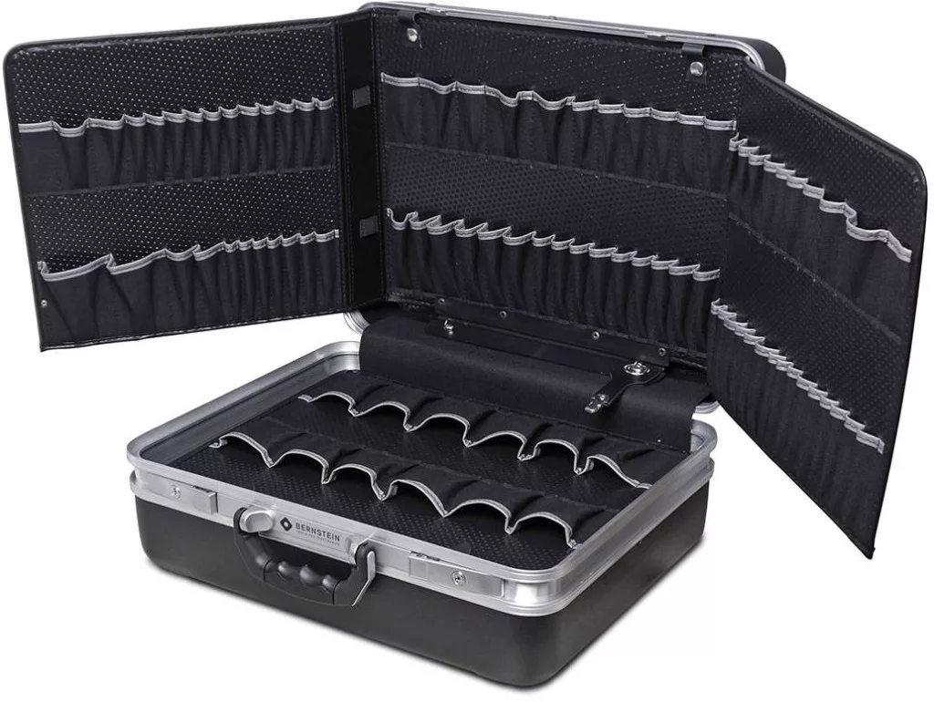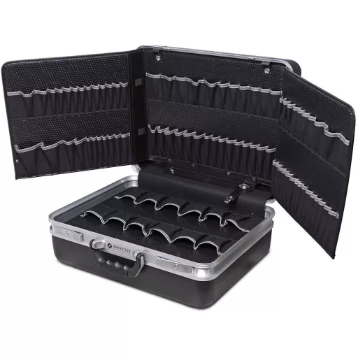 Koffer mélyhúzással készült, ütésálló, barkázott fekete műanyag héjakból, stabil, préselt alumínium kerettel, por- és fröccsenő víz ellen védett, sav- és karcolásálló. A szerszámlapokon lévő áttekinthető, szerszámzsebekről, a kivehető, összecsukható és billenthető részekről megállapítható: Ez egy átrendezhető szerszámos szekrény egy táskában! Egy stabil, 90 mm magas műanyag betét, 6 közfallal a rekeszek áthelyezhető beosztásához a táskában sok helyet kínál tartalék alkatrészek, mérőműszer és forrasztó készülék tárolására. A koffer fedelében a dokumentumok részére egy zseb került rögzítésre. A koffer 2 zárral rendelkezik és lezárható.