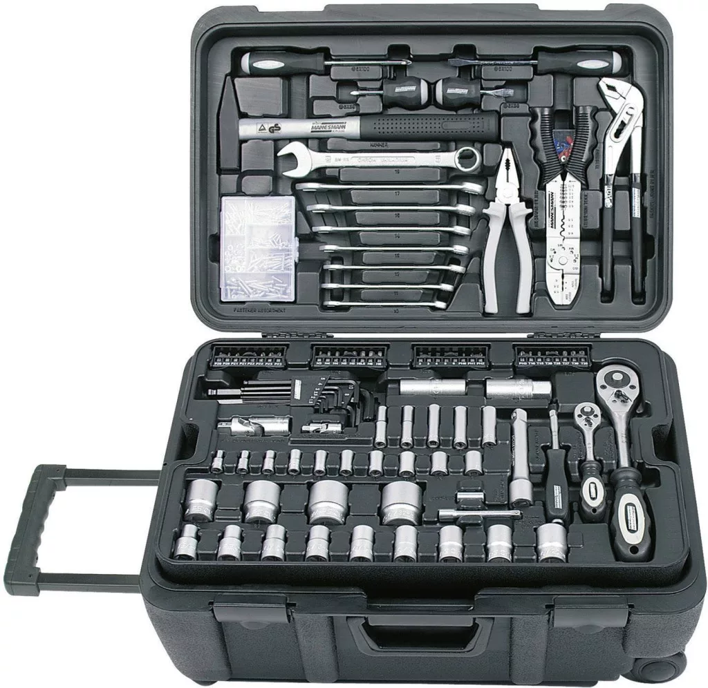 Jellemzők: Az összes szerszám DIN szabvány · Dugókulcs betétek, csavarhúzók, stift kulcsok, villás-gyűrűs kulcsok és bitek króm-vanádium-acél ötvözetből · Matt krómozású felület · További hely még több szerszámnak.