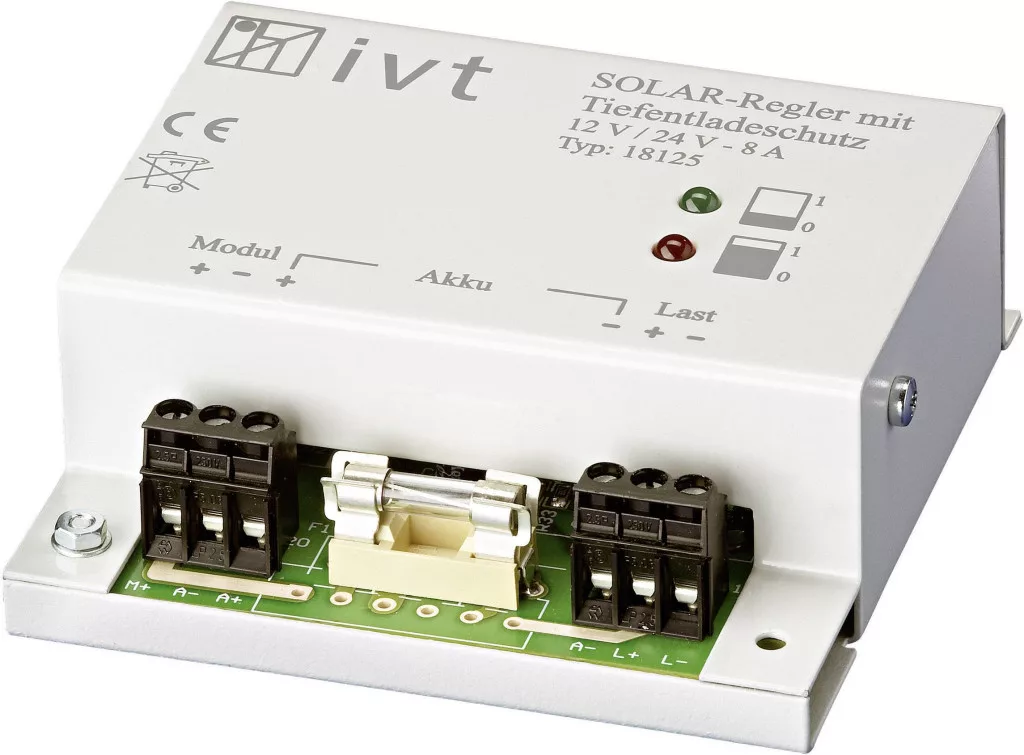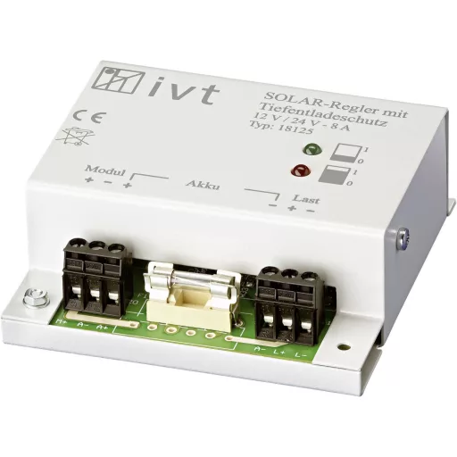 Jellemzők: Beépített hőmérséklet érzékelő · automatikus 12/24 V átkapcsolás · mélykisülés elleni védelem · szabályozási elv: sönt · hőmérséklet kompenzálás.