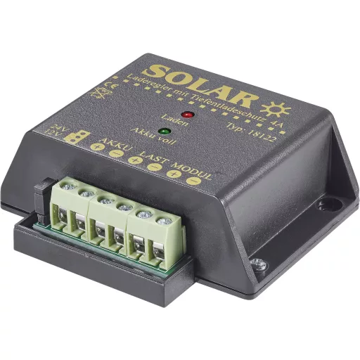Gondoskodjon a megfelelő töltöttségről! Megbízható, kis, napelemes töltésszabályozó 12 V-os készülékekhez, 55 W modul-teljesítménnyel. Az U/I jelleggörbének megfelelő töltés a hozzácsatlakoztatott akkut gyorsan és kíméletesen tölti. Két LED jelzi, hogy az akku fel lett-e töltve, vagy még töltés alatt áll. Mélykisülés elleni védelemmel.