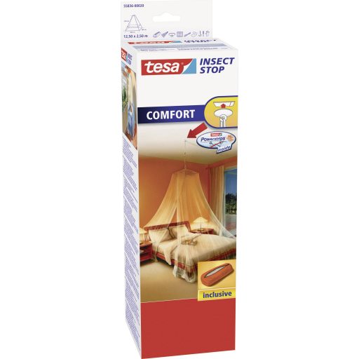 Jellemzők: Magas UV állóság · Egyszemélyes- és kétszemélyes ágyhoz · A Tesa Powerstrips® mennyezeti rögzítő kampó nyom nélkül eltávolítható · Max. 3 m-es mennyezeti magassághoz · Praktikus tárolóban, utazáshoz · Mosható 30 °C-ig · Mennyezeti kampóval.