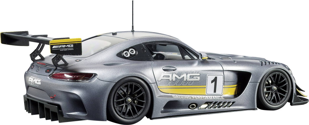 A statikus modell a 2016-os Mercedes-AMG GT3 versenyautó replikája. A GT közúti autó átalakítása magában foglalja például a szénszálas karosszériát és a nagyméretű hátsó szárnyat. Ez a TAMIYA modellkészlet verzió lenyűgözi az alkatrészek nagy pontosságával és a részletekre való precíz odafigyeléssel.