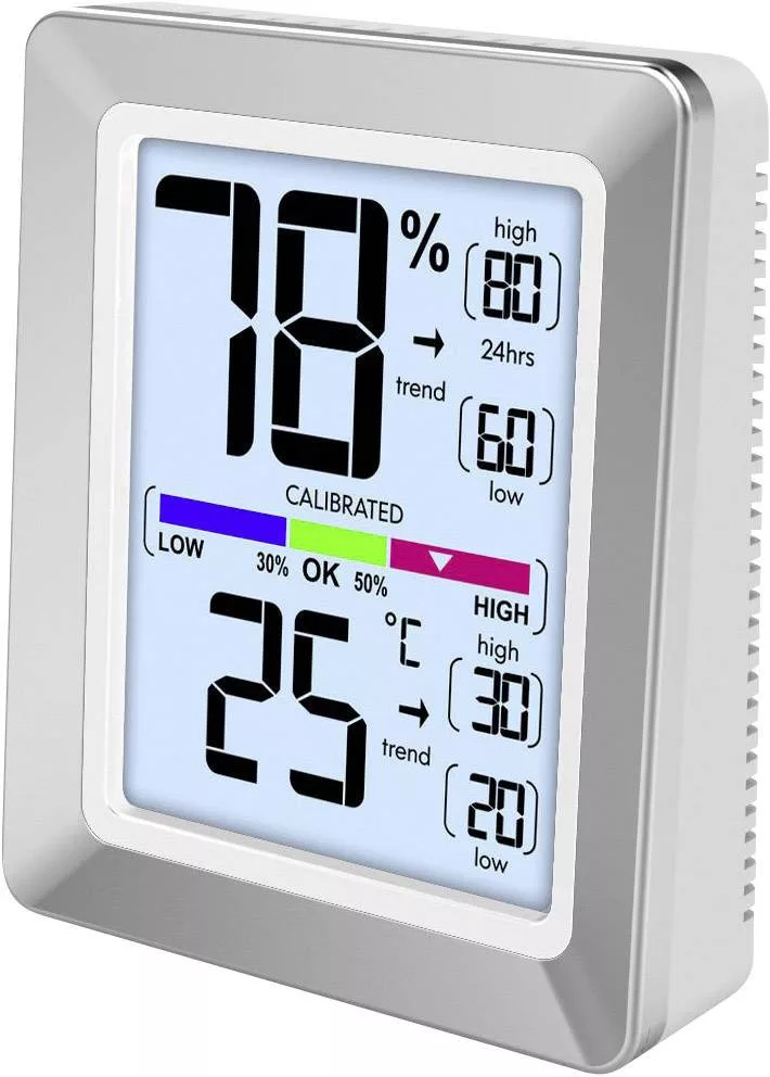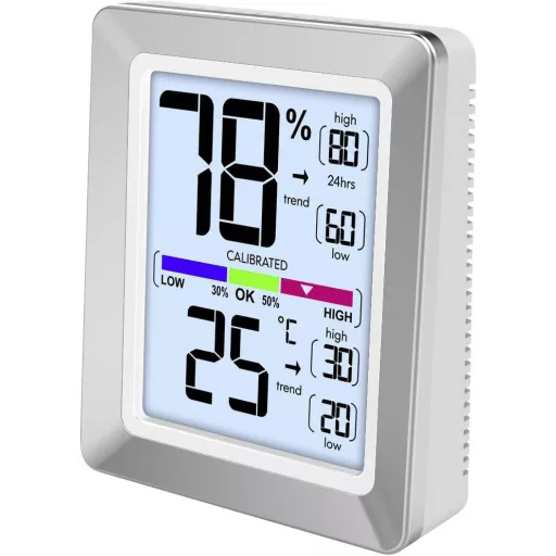 Jellemzők: érintés érzékelő · Chrome megjelenés · Kijelző ° C / ° F-ben · Hőmérséklet trend kijelzés · Légnedvesség kijelző · Nedvesség trendkijelzést · A hőmérséklet és a páratartalom kalibrálható · Színes helyiség komfort jelző · A hőmérséklet és a páratartalom MIN / MAX kijelzése · Háttérvilágítás lágy érintéssel · elemkimerülés jelző · Hőmérséklet és páratartalom a pontosság javítása érdekében · Kalibrálható