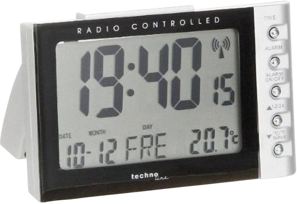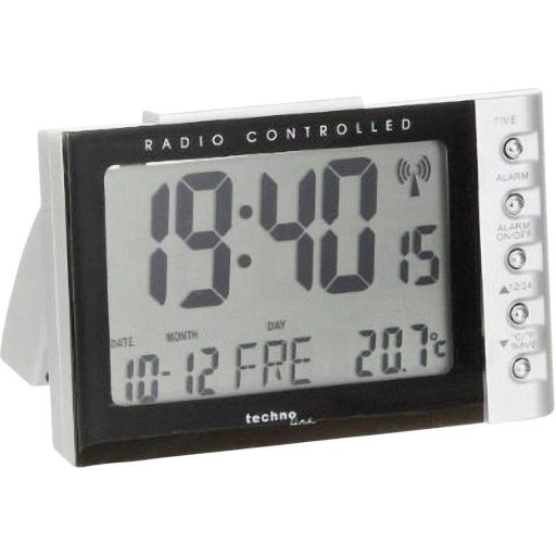 Jellemzők: DCF77 rádiójel vezérlés · Manuális beállítás lehetséges · 12/24 órás időjelzés · Naptár · Időzóna beállítás · Ébresztés · Ébresztés ismétlés · C/F között átállítható hőmérséklet jelzés · Hét napjai (német, angol, spanyol, olasz, francia nyelven) · Háttérvilágítás