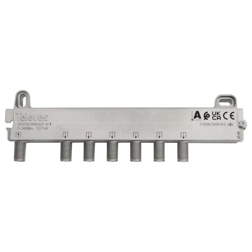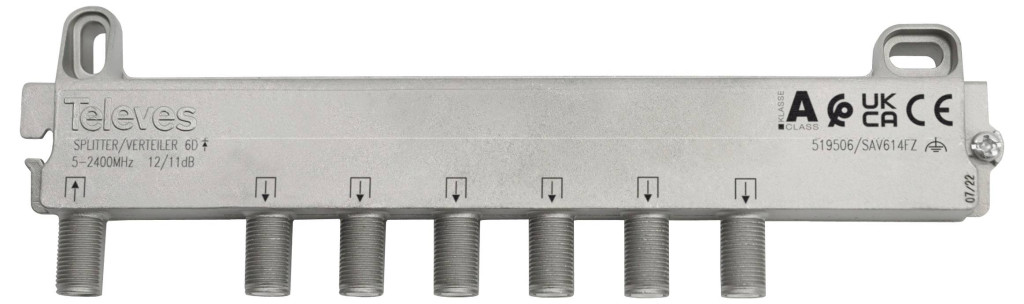 6 utas elosztó 5-2400 MHz, öntött házban, fali hézaggal és F csatlakozókkal. Bemenetek és kimenetek egy oldalon, ezért kevesebb helyet igényel, bűvölésmentesített, DC áteresztő kimenet. -