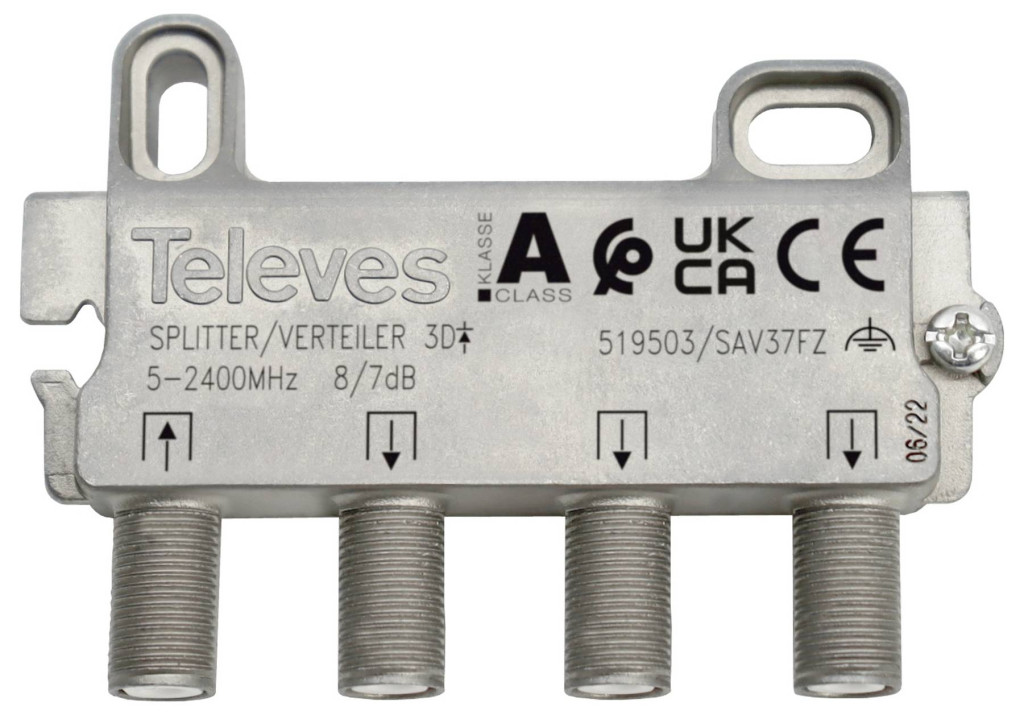 3-utas elosztó 5-2400 MHz, öntött házban, fali hézaggal és F csatlakozókkal. Bemenetek és kimenetek egy oldalon, ezért kevesebb helyet igényel, bűvölésmentesített, DC áteresztő kimenet. -