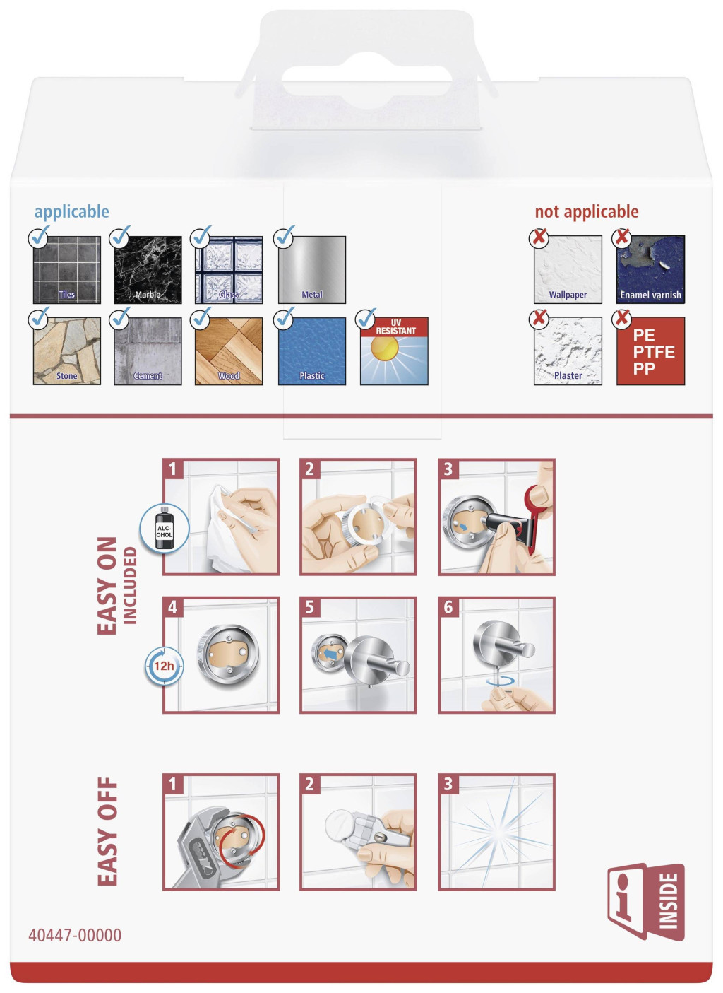 Tipikus tesa: A fejlett és megbízható tesa Power.Kit ragasztómegoldás segítségével ezt a fürdőszobai tartozékot fúrás nélkül szereljük fel. A falak és a csempe nem sérült. Még a tapasztalatlan felhasználók is használhatják ezt az egyszerű technológiát. Az adapter eltávolításakor nem marad nyom a felületen. A tartozékok ezután egyszerűen újrafelhasználhatók egy új, megfelelő adapterrel. Figyelem! A használat során veszélyes belélegezhető por keletkezhet. A porát ne lélegezze be.