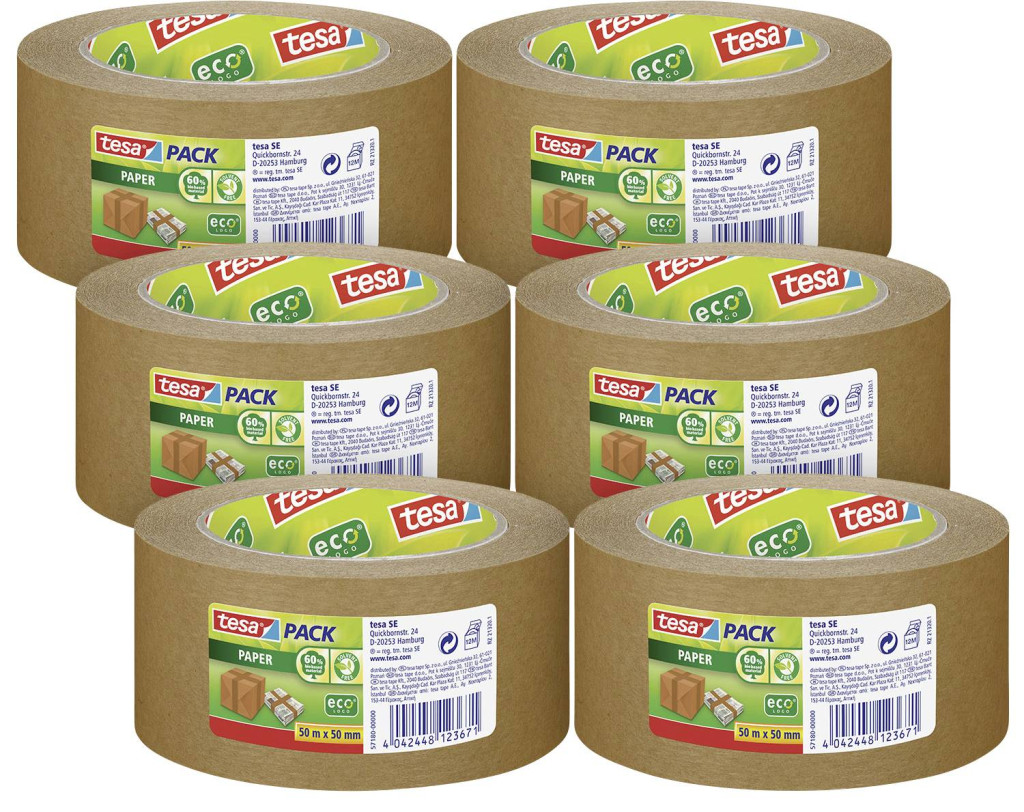 tesapack Paper ecoLogo 6 csomagban - környezetbarát csomagolószalag papírból, 60% bio -alapú anyag - barna - 6 db 50 m -es tekercs