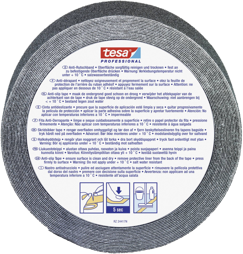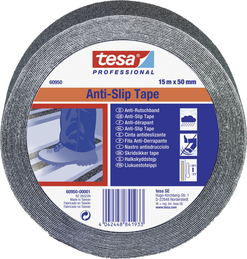 A tesa® 60950 csúszásgátló ragasztószalagot beltéren és kültéren használják, és biztosítja a biztonságos tartást a biztonság szempontjából fontos területeken. Alumínium-oxiddal bevont PVC hátlap és akrilát ragasztó kombinációja biztosítja a csúszásgátló hatást. A tesa® 60950 a DIN 51130 szerint tanúsított, és az is jellemzi, hogy ellenáll a sós víznek és vegyszereknek, kézzel elszakítható és könnyen eltávolítható.