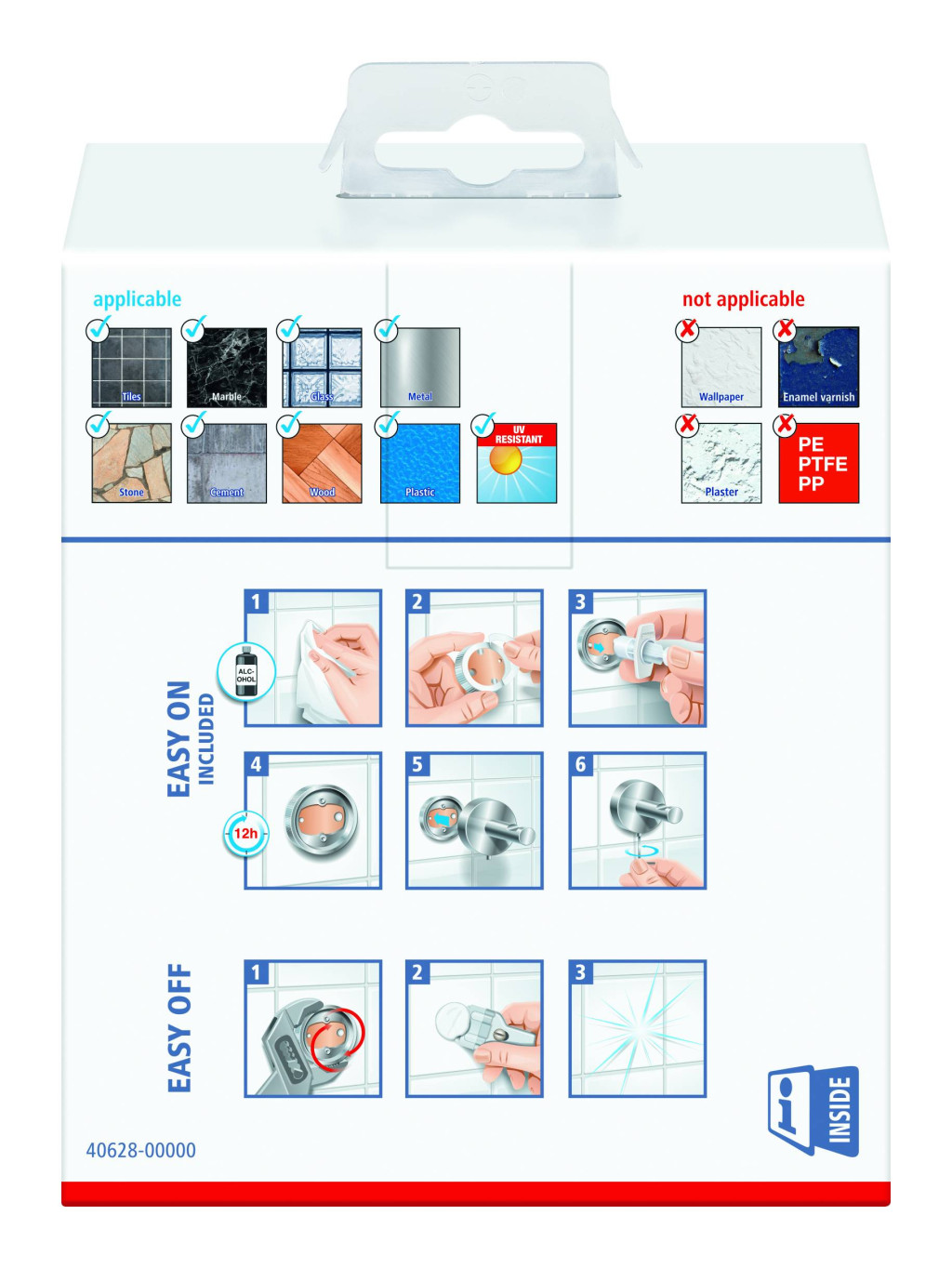 Számos felületen használható: csempékhez, fémekhez, természetes kőhöz, márványhoz, üveghez, fához és sok műanyaghoz - nem alkalmas vakolathoz, tapétához, fali textíliákhoz és műanyagokhoz, mint például PP, PE és PTFE