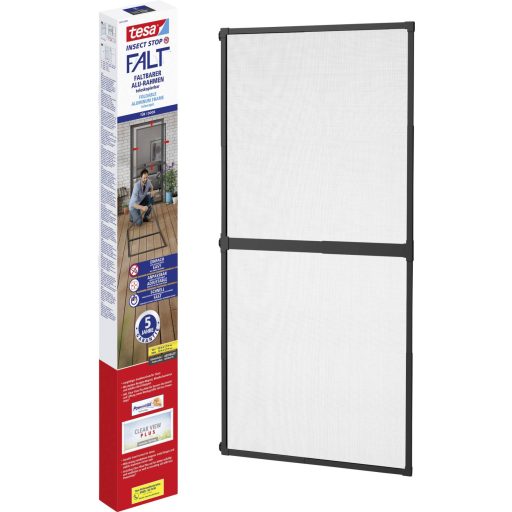 A tesa® INSECT STOP FALT összecsukható alumínium keret ajtókhoz a legkönnyebben összeszerelhető tesa alumínium keret, amely zökkenőmentesen alkalmazkodik a legtöbb ajtó méretéhez, és hosszú távú védelmet nyújt a rovarok ellen. A kiváló minőségű és innovatív tesa® Insect Stop FALT ajtókeret egyszerűen, mérés nélkül rögzíthető: Az egyszerű, de hatékony tartókonzolok, amelyeket tesa Powerstrips®-el rögzítenek, a helyén tartják a FALT keretet a méret meghatározásához, a FALT pedig a keret rögzítéséhez az ajtókerethez. A Clearview Plus üvegszál optimális szellőzést és jó láthatóságot biztosít magas mechanikai ellenállás mellett.