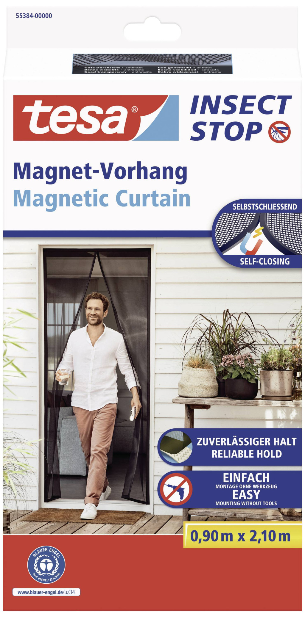 Mindenki ismeri a problémát, különösen nyáron – a rovarok az erkély- vagy teraszajtót használják, hogy bejussanak a nappaliba. A tesa önzáró mágneses függönye innovatív és rendkívül praktikus módszert kínál a hatékony rovarvédelem és az optimalizált életkomfort kombinálására. Mert a csíkmentes, antracit színű függöny az anyag nagy átlátszósága miatt nem rontja az átlátszóságot. Szintén figyelemre méltó a szúnyogfüggöny csendes, szinte önálló nyitása és zárása – ehhez nem kell a kezét használni. A belevarrt 30 mágnes felelős azért, hogy a rovarfüggöny magától kinyílik és bezárul, ha átlépünk rajta. Ezt különösen értékelik a gyermekes családok vagy az állattartók. További előnye az egyszerű összeszerelési mód, amely teljesen kiküszöböli a fúrás szükségességét. A széles tépőzáras szalag erőteljes ragasztási technológiával ezt lehetővé teszi. A beépítési mód nemcsak egyszerű, hanem bérelt lakásokhoz is ideális, mivel itt nem maradnak lyukak. A beszerelés egyszerű, és kézi ismeretekkel nem rendelkezők is elvégezhetik: Először vágja méretre a tépőzárat, majd rögzítse az ajtókeret körül - rögzítse a függönyt tépőzárral - kész. A légfüggöny könnyen kézzel mosható 30°C-on.