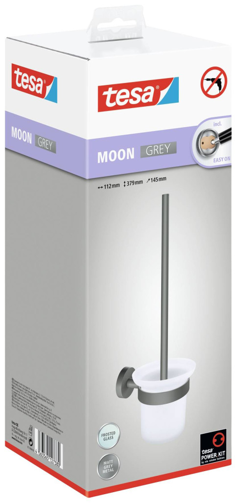 A kefetartóból, minőségi szaténüvegből készült tartályból és WC keféből álló készlet nem csak szép, de rendkívül higiénikus is.Mindenkinek, aki szereti a modern életmódot a fürdőszobájában, a tesa MOON design sorozat vonzó fürdőszobai választékot kínál kiegészítők. Legyen szó ipari stílusról, vintage megjelenésről, Scandi stílusról vagy loft jellegű fürdőszobáról – a matt és purisztikus dizájnnak és az organikus formának köszönhetően a tesa MOON stílusosan illeszkedik az aktuális fürdőszobai trendekbe. Ez a dizájnvonal még a népszerű vintage megjelenéshez is tökéletesen passzol. A fejlett és megbízható ragasztómegoldásnak köszönhetően a szerelés fúrás nélkül történik. A falak és a csempék nem sérültek. Már a tartozék eltávolítása sem hagy nyomot a felületen. A termék ezután egyszerűen újrafelhasználható egy új, megfelelő adapterrel.