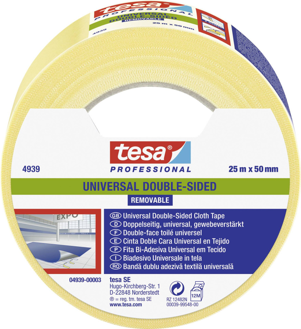 Ha csak rövid időre szeretne textilszőnyegeket fektetni, akkor a tesa® 4939 kétoldalas ragasztószalag a megfelelő választás! Gyakran használják mindenféle rendezvényen, például vásárokon, kiállításokon vagy mozi premiereken. Mivel a szerelőszalag erősebben tapad a szőnyeghez, mint az aljzathoz - vagyis különböző tapadási erők vannak -, a szőnyeget könnyen és maradék nélkül eltávolíthatjuk 14 napon belül. A robusztus szerelőszalag egy szövet hátoldalából és egy szintetikus kaucsukból készült ragasztóból áll.