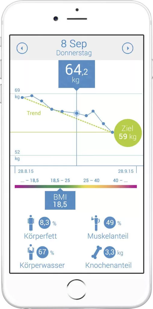 A BS 444 connect testanalizáló mérleg nagy érzékenységű, nemesacél elektródákkal precízen méri a testzsír-, vízhányad és izömtömeg értékeket. Ezen összes érték összjátéka egy döntő tényező a célsúly elérésének egészséges módon és fontos útmutató a hatékony fitnesz programhoz.