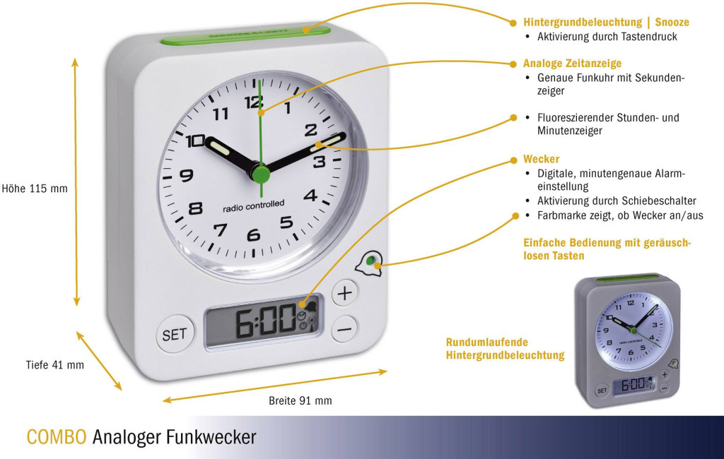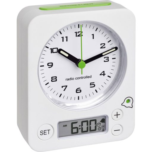 Műszaki adatok: Fluoreszkáló: Mutató · Funkciók: Riasztás,Rádiójel (DCF77) · Ház anyaga: Műanyag · Házszín: Fehér · Kivitel: Rádiójel vezérlésű · Méret, hossz: 115 mm · Méret, magasság: 91 mm · Méret, szélesség: 41 mm · Számlap/kijelző szín: Fehér · További műszaki adatok: Digitális ébresztés beállítás (percnyi pontossággal) · Tápellátás: 3 db mikroelem (nem szállítjuk vele) · Típus: Ébresztőóra