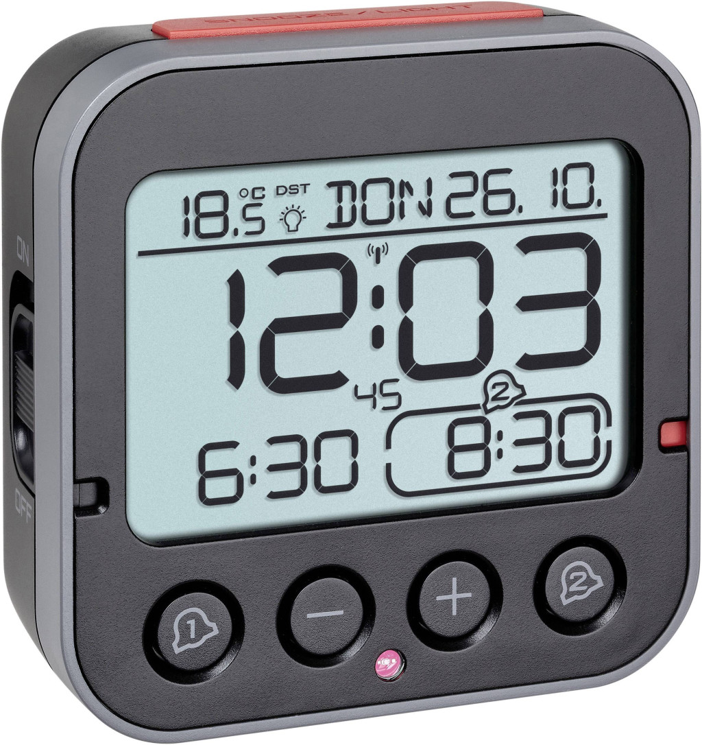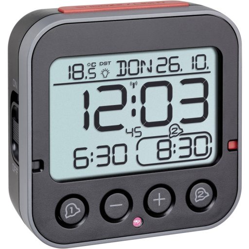 Műszaki adatok: Funkciók (órák): Riasztás, Belső hőmérséklet, A hét napjainak kijelzése, Rádiójel (DCF77), Dátum, Vétel kijelzése · Ház anyaga: Műanyag · Házszín: Fekete · Kijelző (digitális/mechanikus/analóg): digitális · Kivitel (órák): Derékszögű · Méret, hossz: 95 mm · Méret, magasság: 96 mm · Méret, szélesség: 41 mm · Riasztási idők: 2 · Tápellátás: 3 db ceruzaelem (nem szállítjuk vele) · Vezeték nélküli töltő funkció: Nem · Óra jellemzők: Nagy kijelző