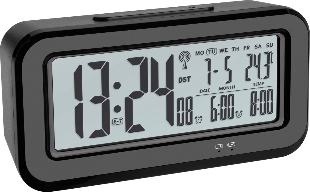 Jellemzők: Mikro USB kábellel tölthető · 2 ébresztési idő · Ébresztés ismétlés · Beállítható ébresztési ritmus (H-V, H-P, Szo-V) · Beltéri hőmérséklet · A hét napja · Dátum · Automatikus háttérvilágítás fényérzékelővel · Nagyméretű LC kijelző · Rádiójel vezérlésű DCF-77 óra · Időzóna · Manuális beállítási lehetőség · Be-kikapcsoló