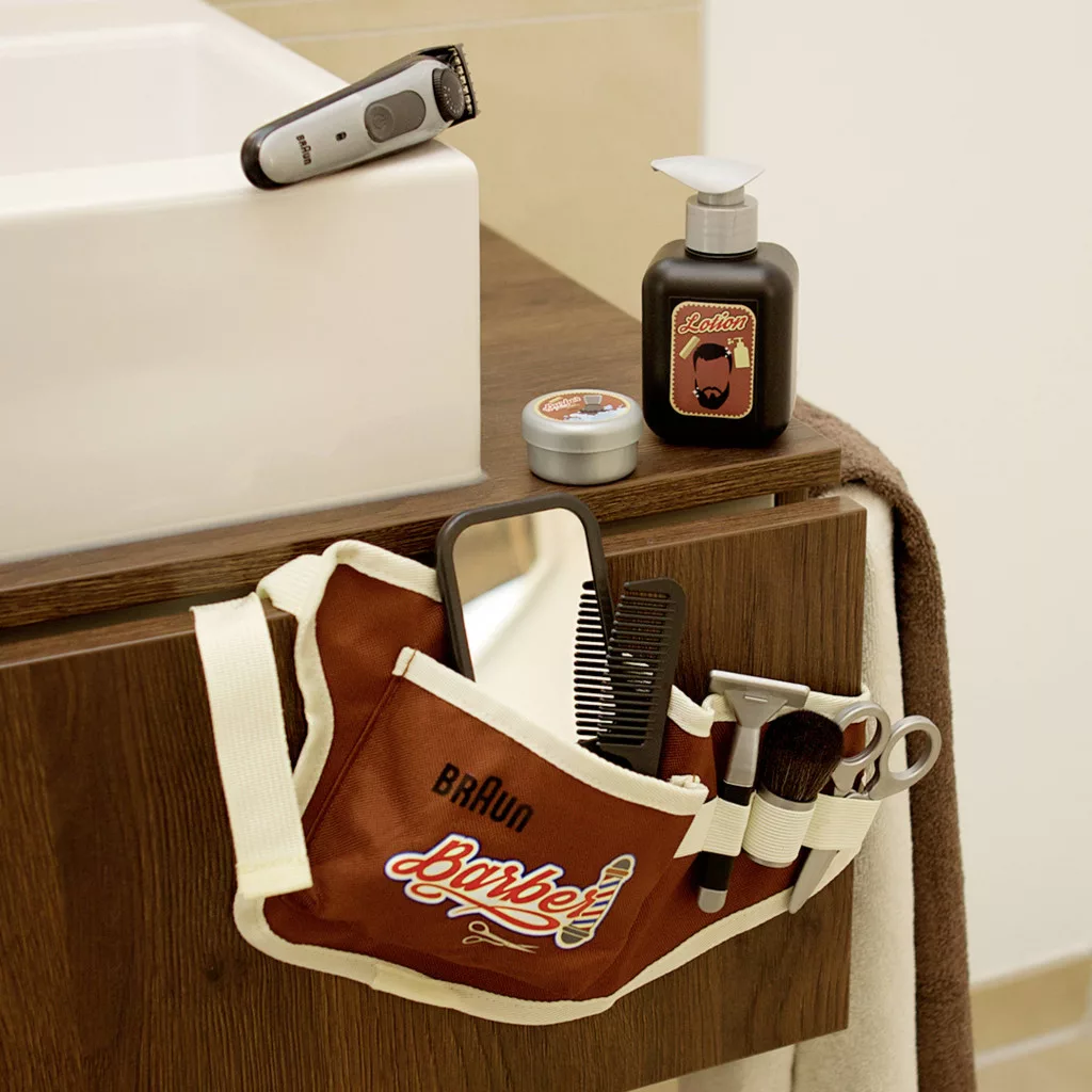 Különösen menő az elegáns Braun dizájnú, elemes szakállvágó, amely egyetlen gombnyomásra zümmög és búg, akárcsak apa fürdőszobafiókjából származó nagytestvére.