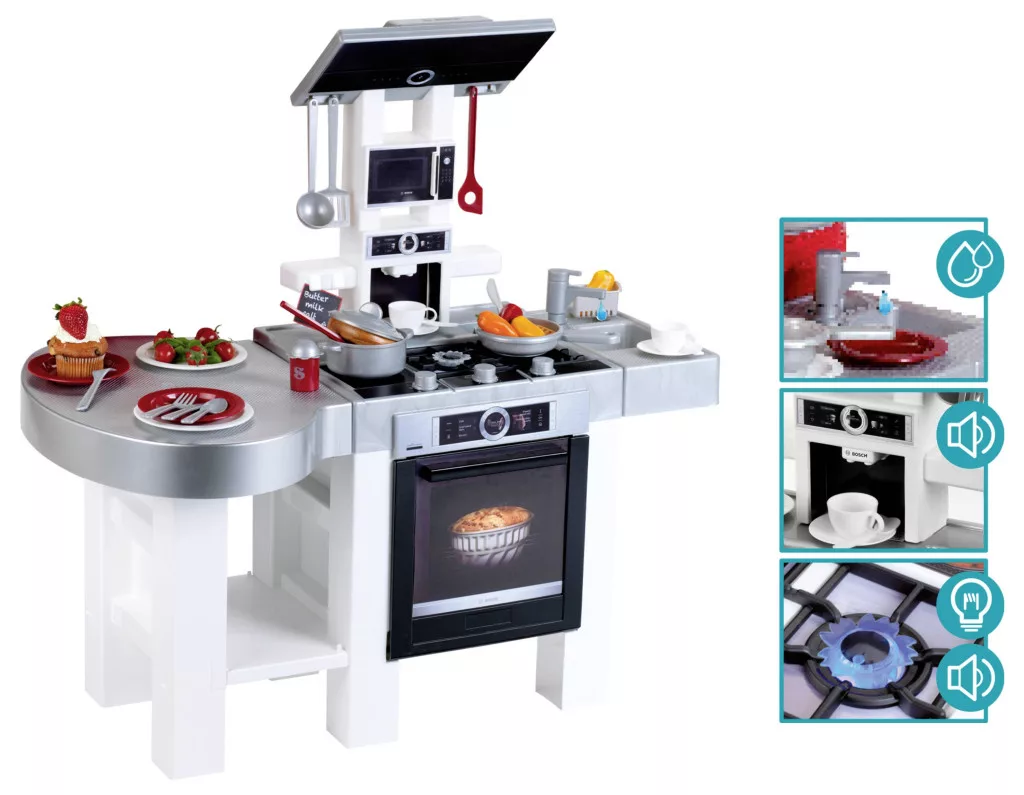 A Bosch formatervezésű modern konyha Németországban készül, és mindkét oldalról használható. A számos játéklehetőség mellett számos kiegészítőt is kínál: elektronikus főzőhangokkal és beépített fénymodullal ellátott főzőlapokat, hangfunkcióval ellátott kávéfőzőt és pumpás csapteleppel ellátott mosogatót. Praktikus tárolási lehetőségek és a tűzhely felett páraelszívó található. Annak érdekében, hogy a gyerekek változatos, játékos főzési tevékenységekben részesülhessenek ebben a stílusos gyerekkonyhában, egy serpenyő, egy fedővel ellátott fazék és praktikus edények is rendelkezésre állnak. Ez tartalmaz egy spatulát, 2 fakanál és egy só- és borsszórót. Van egy két személyes étkezőgarnitúra is, amely egy tányérból és egy levesestányérból, valamint egy villából, késből és kanálból áll, és 2 eszpresszókészlet, amely egy csészéből, egy csészealjból és egy kávéskanálból áll.
