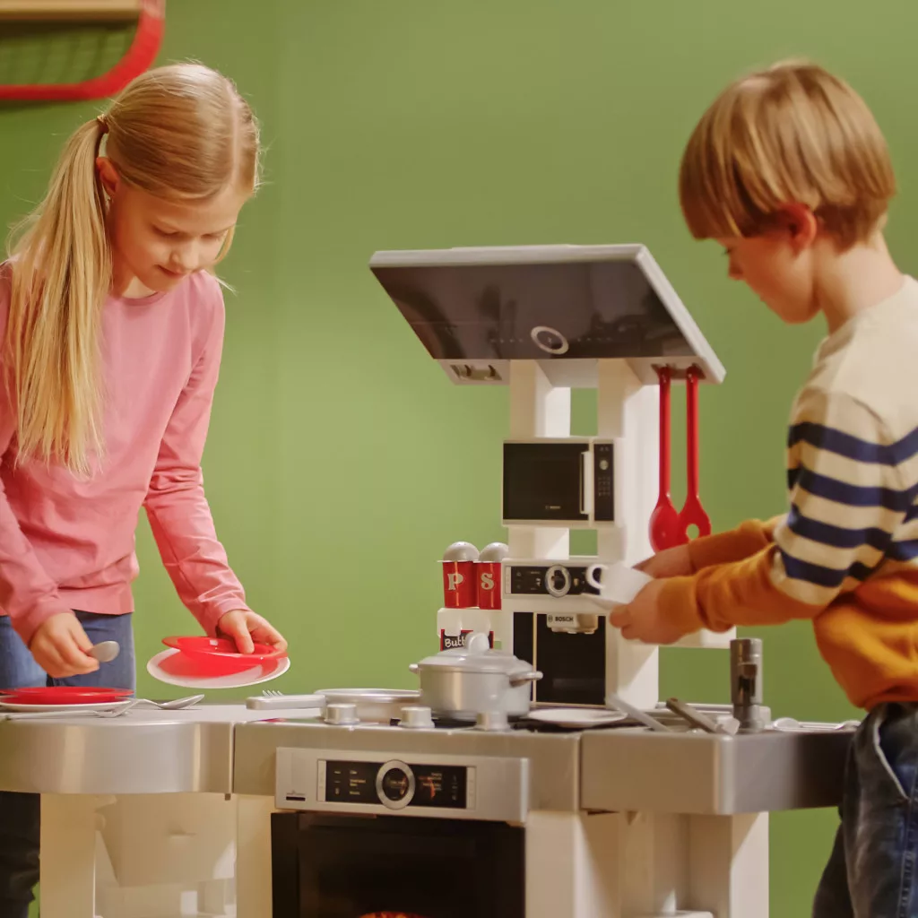 Ez a Bosch által tervezett konyha a „Modern stílus” nevet viseli – és több mint hű a nevéhez. Stílusos fehér és ezüst színben igazi tekinteteket vonz a gyerekszobába, és mindent kínál, amiről a kis főzőrajongók álmodnak: Bekapcsolhatják a főzőlapokat, és finom ételeket készíthetnek főzési hangok és fényeffektek kíséretében. Amikor desszertnek kávét főznek, az is úgy hangzik, mint anya és apa konyhája, és amikor elmosogatják a díszes edényeket, azt úgy tehetik, mint a felnőttek, igazi vízzel: egyszerűen csak pumpálnak vizet a csapon keresztül, és a kicsik felnőttnek érzik magukat. Így a gyerekek játékosan gyakorolják a konyhai folyamatokat, megtanulják a főzőeszközök használatát és rengeteget szórakoznak.