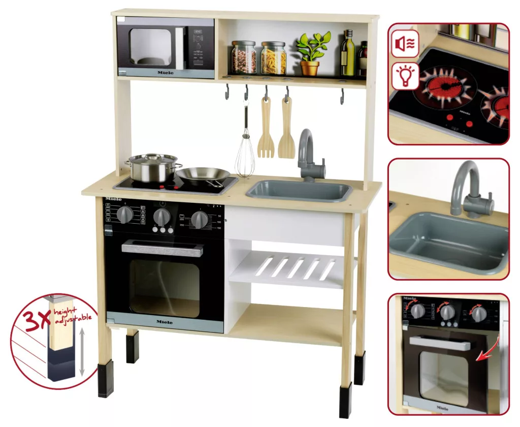 Ez a Miele dizájnú gyerekkonyha kiváló minőségű fából készült, és mindent tartalmaz, amire a kis ínyenceknek szükségük van a főzéshez.