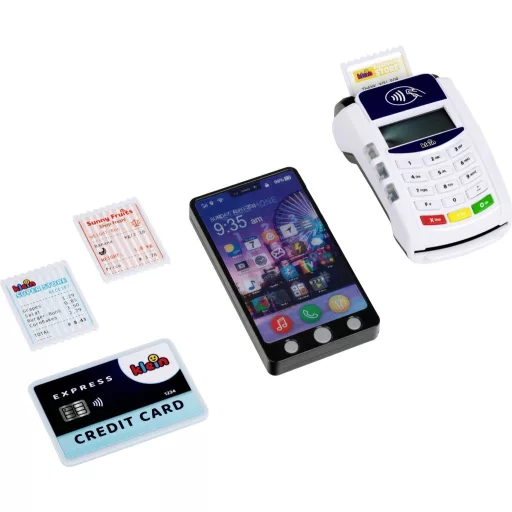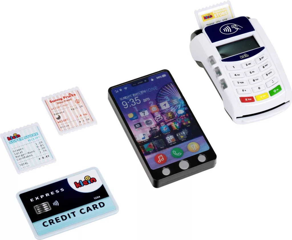 A 7 darabos készlet tartalmaz egy POS terminált, egy fény- és hangfunkciókkal ellátott gyermek mobiltelefont, egy érintésmentes fizetési lehetőséget kínáló bankkártyát és három nyugtakártyát - ideálisak a fantáziadús szerepjátékhoz.
