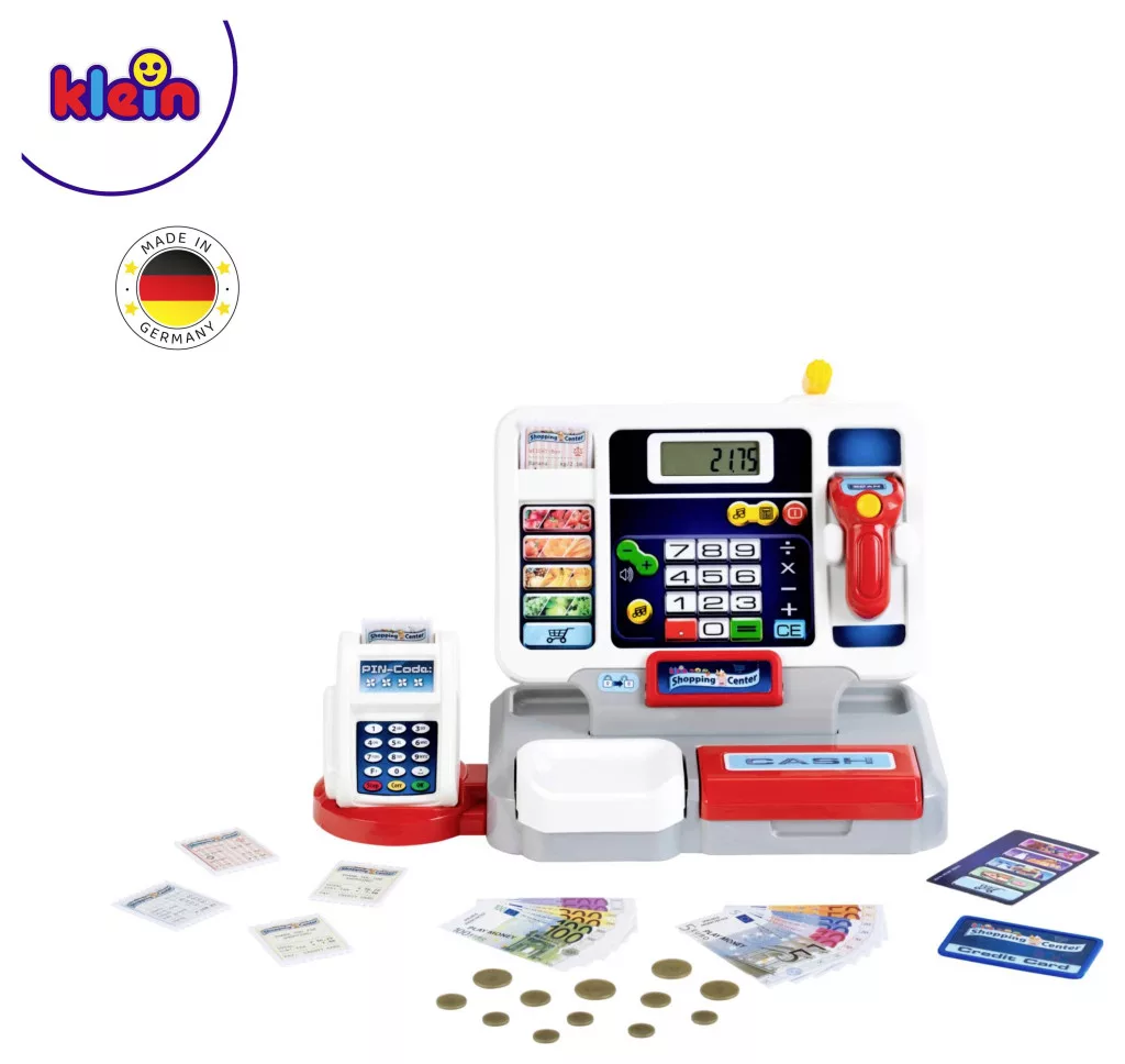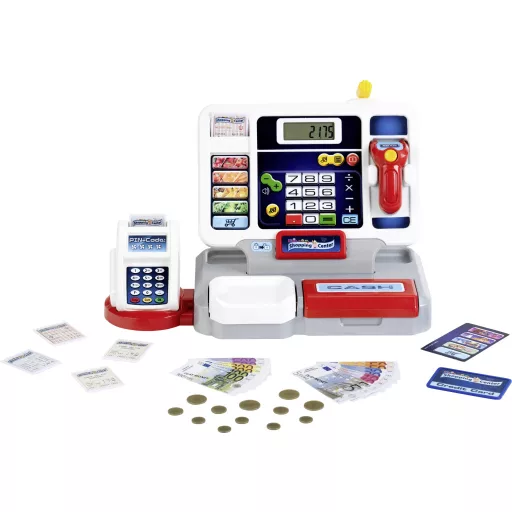 A modern, elemes játék pénztárgép kivehető, számológép funkcióval ellátott tablettel rendelkezik. A pénztárgép billentyűzetének van egy váltógombja, amely lehetővé teszi a gyerekek számára, hogy válasszanak a számológép és a hangprojektor között. Van még egy szkenner, egy pénztárgép rekesz, egy választékkártya a mérleg területén található gombok képeinek cseréjéhez, és egy másik választékkártya, amelyet saját maga tervezhet. Természetesen játékpénz is található a csomagban: kiváló minőségű műanyagból készült érmék (öt darab 1 centes, három 2 centes, két 5 centes és két 10 centes érme) és tartós bankjegyek (két darab 5, 10, 20, 50, 100, 200 és 500 eurós bankjegy), hat blokkkártya és egy hitelkártya.