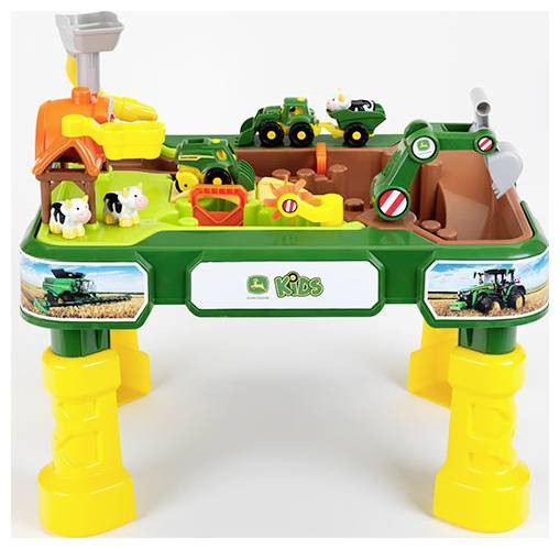 A színes játékfarm tartalmaz egy John Deere traktort, egy kombájnt és egy kotrógépet. Maga a farm egy istállóból, egy tehén- és járműmosó létesítményből, valamint három játéktehénből áll. A játékasztal két nagy, kivehető homok- és vízmedencével, felvonóhíddal, vízválasztókkal, vízkerékkel és egy kis ültetőmedencével rendelkezik.