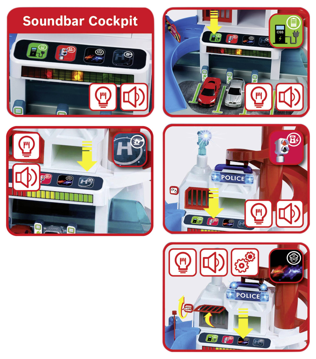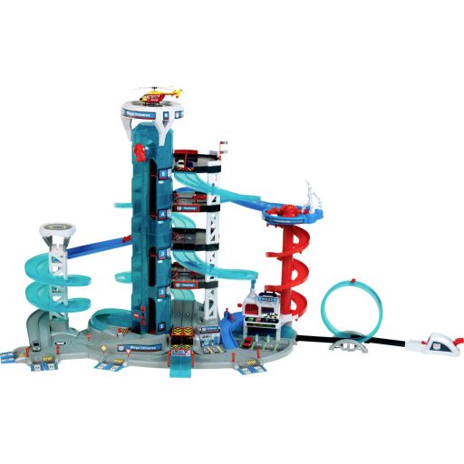 Ez a maga nemében a legnagyobb parkolóház öt szinttel, parkolóhelyekkel, két sávos versenyekkel és számos extrával: manuálisan működtethető elektronikus páternoszter lifttel, hurokkal ellátott katapulttal, alagúttal és félcsővel. Egy forgó giroszkóp mechanikus robot gyártósorral és az azt követő orsótorony-ereszkedéssel szintén hozzájárul a gyors tempójú szórakozáshoz. Van még egy elektronikus pilótafülke elektromos töltőállomással, egy helikopter-leszállópálya, egy rendőrőrs zárható börtöncellával és egy sebességmérő kamera – mindegyikhez illő, klassz fény- és hangeffektek tartoznak. A bárhová rögzíthető síugrósánc és leszállópálya, a körszámlálóval ellátott célvonal és az öt darab 1:64-es méretarányú jármű is különösen szórakoztató.