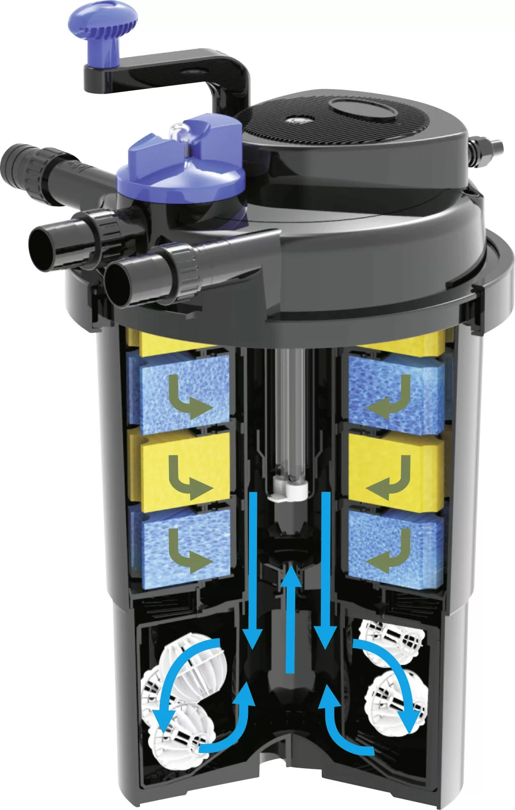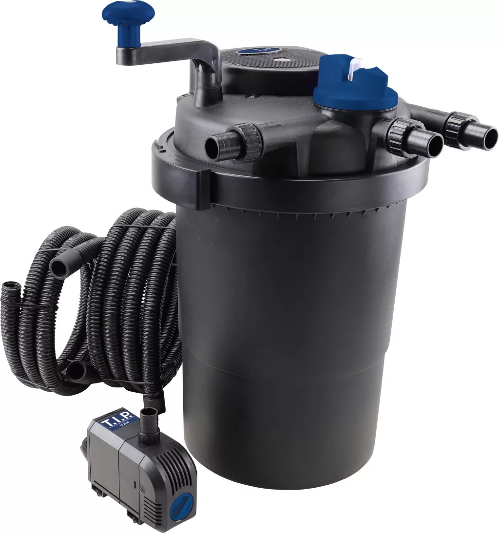 Tó nyomásszűrő UV-C lámpával, szivattyúval és 20 literes nyomástartóval. 11 wattos UV-C lámpával, funkcióválasztó kapcsolóval, minden szűrőanyaggal, tömlővel és minden csatlakozással. Nagy teljesítményű szűrőszivattyúval. A szűrőfej egy funkcióválasztó kapcsolóval van felszerelve, amely egyszerűen elforgatva aktiválja a szűrő vagy a visszamosás funkciót. A tisztítás a szűrő kinyitása és a telepítés megváltoztatása nélkül lehetséges. Üzem közben túlnyomás van a szűrőrendszerben. Ez jelentősen növeli az egyes szűrőfokozatok hatékonyságát a hagyományos külső szűrőkhöz képest. 10 000 literes tavakig.