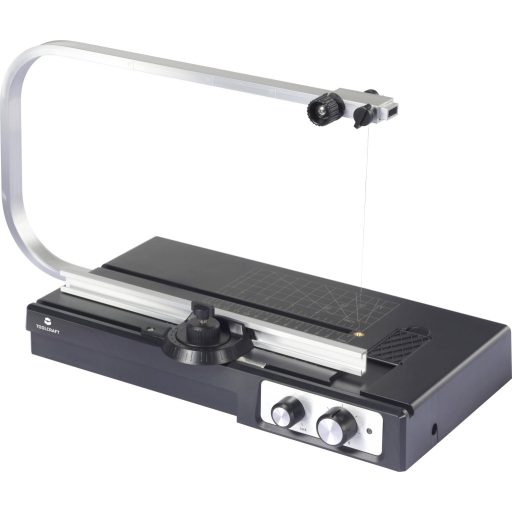 Nagy munkafelület, praktikus munkasegédekA Toolcraft habszivacs asztali vágója 375 x 210 mm alapfelülettel és 180 mm-es kiemelkedésű, 360 mm-es mélységű robusztus fémkerettel rengeteg helyet kínál a kényelmes munkavégzéshez. Az adagolósín zárható és sima vágást tesz lehetővé. A forró kés hegye merülő vágásokhoz használható.