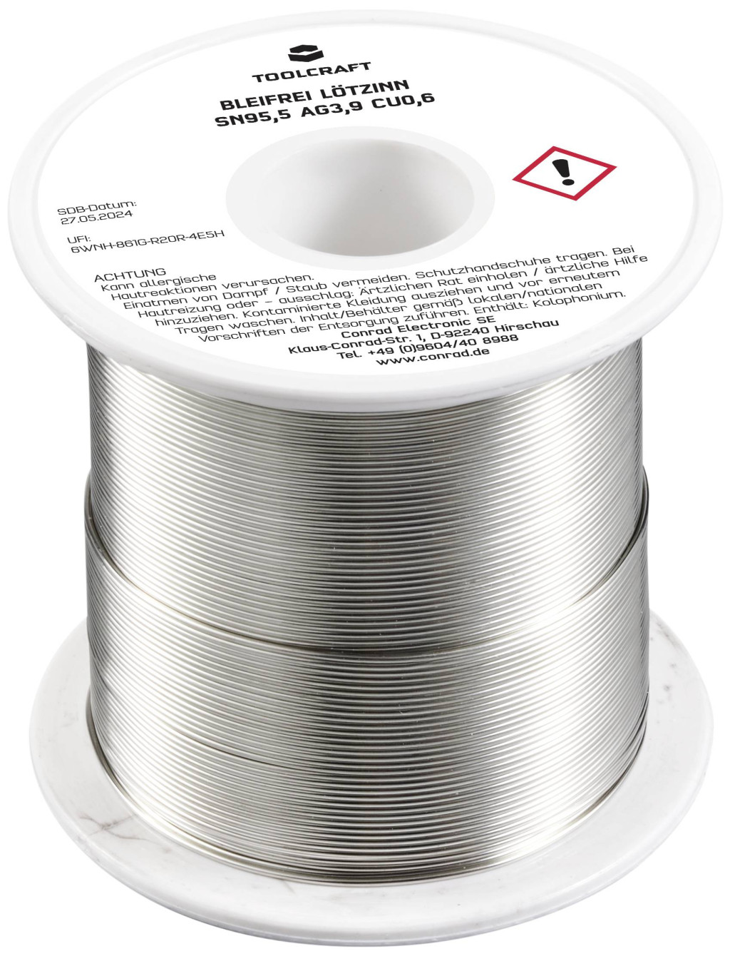 Műszaki adatok: Biztonsági tudnivalók / H mondatok: H 317: Allergiás bőrreakciót válthat ki. · Biztonsági tudnivalók / P mondatok: P 261: Kerülje a por/füst/gáz/köd/gőzök/permet belélegzését., P 280: Védőkesztyű/védőruha/szemvédő/arcvédő használata kötelező., P 333+313: Bőrirritáció vagy kiütések megjelenése esetén: Orvosi ellátást kell kérni., P 362+364: A szennyezett ruhát le kell vetni és az újbóli használat előtt ki kell mosni., P 501: A tartalom/edény elhelyezése hulladékként: … · Biztonsági tudnivalók, GHS: GHS07: Irritáló · Folyasztószer típus: ROL1 · Huzal átmérő: 0.7 mm · Jelölő szó (veszélyes anyag): Figyelem · Kivitel (forrasztóón): Tekercs · Műanyagmentes csomagolás: Műanyagmentes csomagolás · Súly: 250 g · Ötvözet: Sn95,5Ag3,9Cu0,6