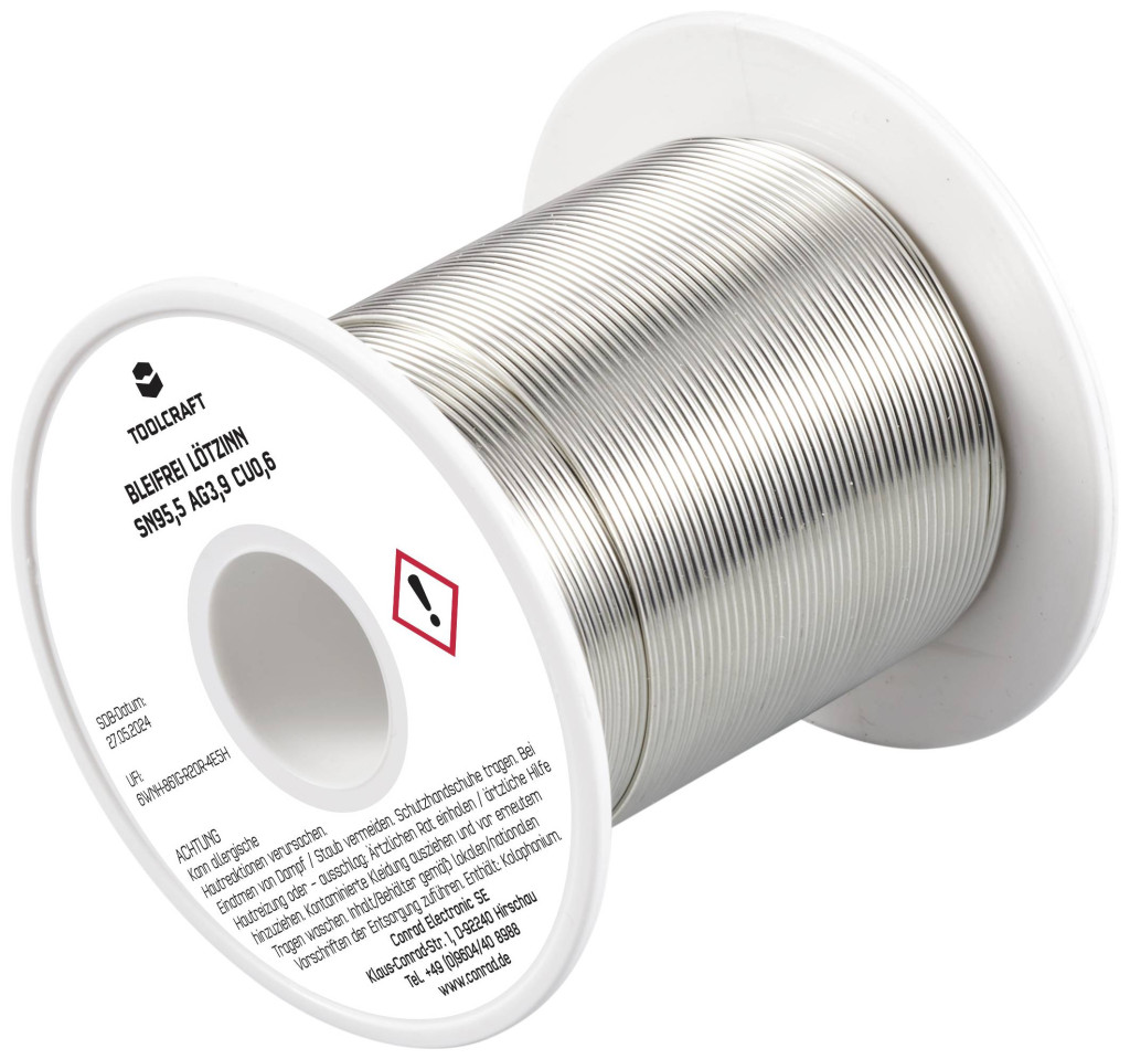 Műszaki adatok: Biztonsági tudnivalók / H mondatok: H 317: Allergiás bőrreakciót válthat ki. · Biztonsági tudnivalók / P mondatok: P 261: Kerülje a por/füst/gáz/köd/gőzök/permet belélegzését., P 280: Védőkesztyű/védőruha/szemvédő/arcvédő használata kötelező., P 333+313: Bőrirritáció vagy kiütések megjelenése esetén: Orvosi ellátást kell kérni., P 362+364: A szennyezett ruhát le kell vetni és az újbóli használat előtt ki kell mosni., P 501: A tartalom/edény elhelyezése hulladékként: … · Biztonsági tudnivalók, GHS: GHS07: Irritáló · Folyasztószer típus: ROL1 · Huzal átmérő: 1 mm · Jelölő szó (veszélyes anyag): Figyelem · Kivitel (forrasztóón): Tekercs · Műanyagmentes csomagolás: Műanyagmentes csomagolás · Súly: 100 g · Ötvözet: Sn95,5Ag3,9Cu0,6
