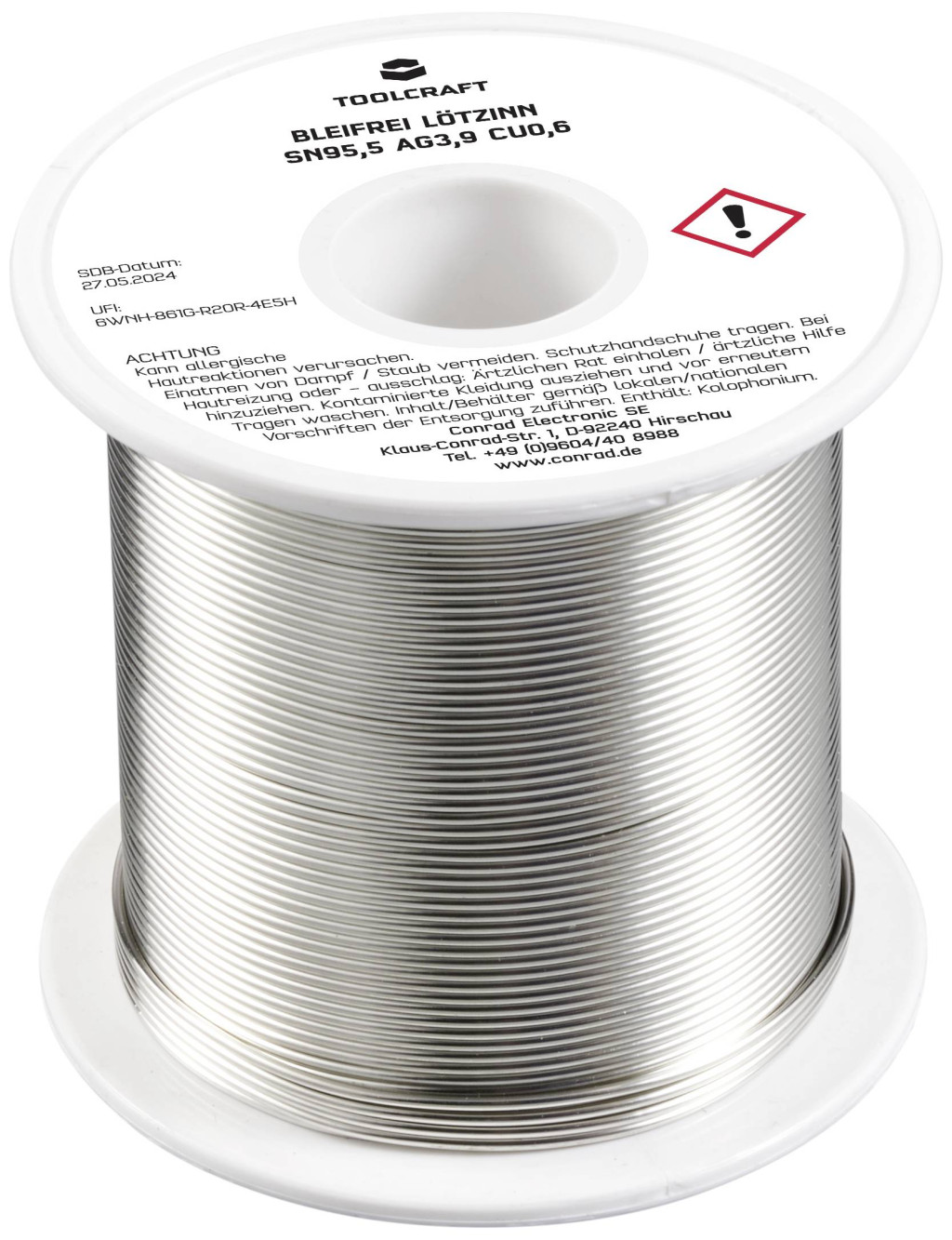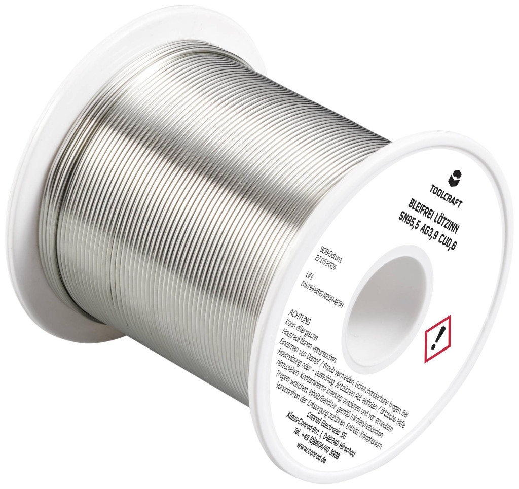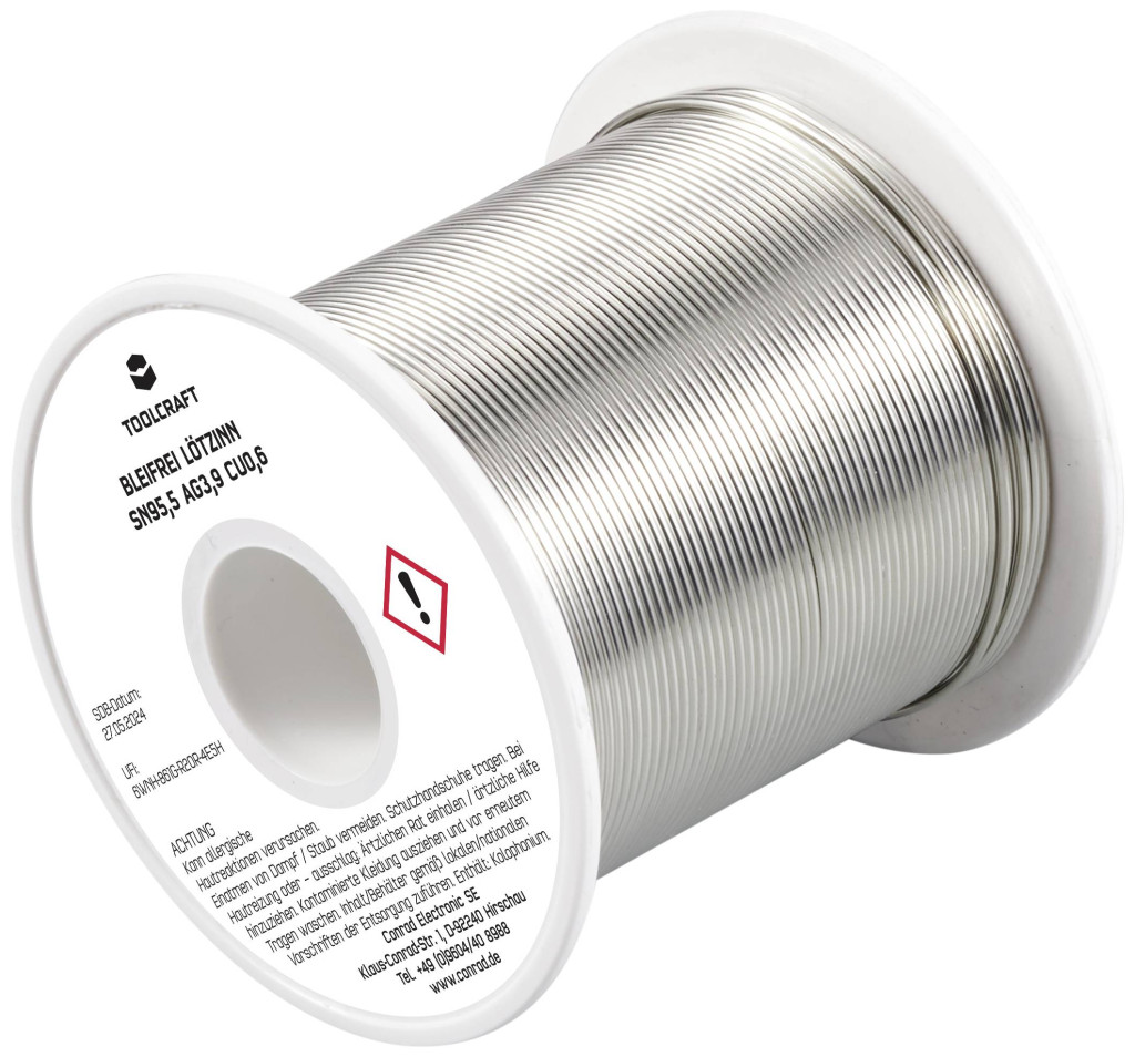 Műszaki adatok: Biztonsági tudnivalók / H mondatok: H 317: Allergiás bőrreakciót válthat ki. · Biztonsági tudnivalók / P mondatok: P 261: Kerülje a por/füst/gáz/köd/gőzök/permet belélegzését., P 280: Védőkesztyű/védőruha/szemvédő/arcvédő használata kötelező., P 333+313: Bőrirritáció vagy kiütések megjelenése esetén: Orvosi ellátást kell kérni., P 362+364: A szennyezett ruhát le kell vetni és az újbóli használat előtt ki kell mosni., P 501: A tartalom/edény elhelyezése hulladékként: … · Biztonsági tudnivalók, GHS: GHS07: Irritáló · Folyasztószer típus: ROL1 · Huzal átmérő: 1 mm · Jelölő szó (veszélyes anyag): Figyelem · Kivitel (forrasztóón): Tekercs · Műanyagmentes csomagolás: Műanyagmentes csomagolás · Súly: 250 g · Ötvözet: Sn95,5Ag3,9Cu0,6