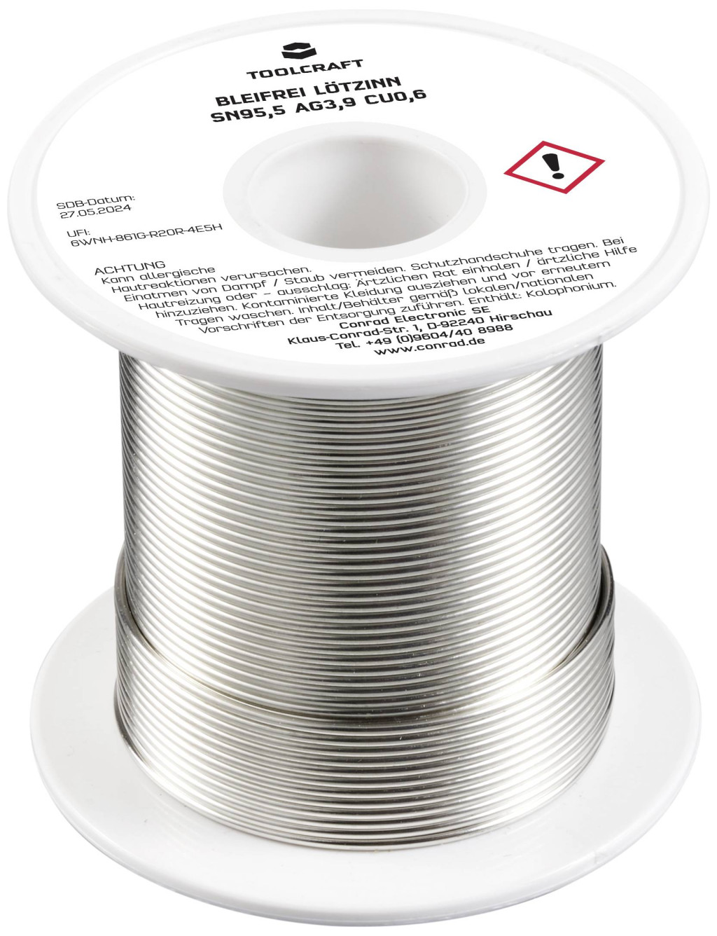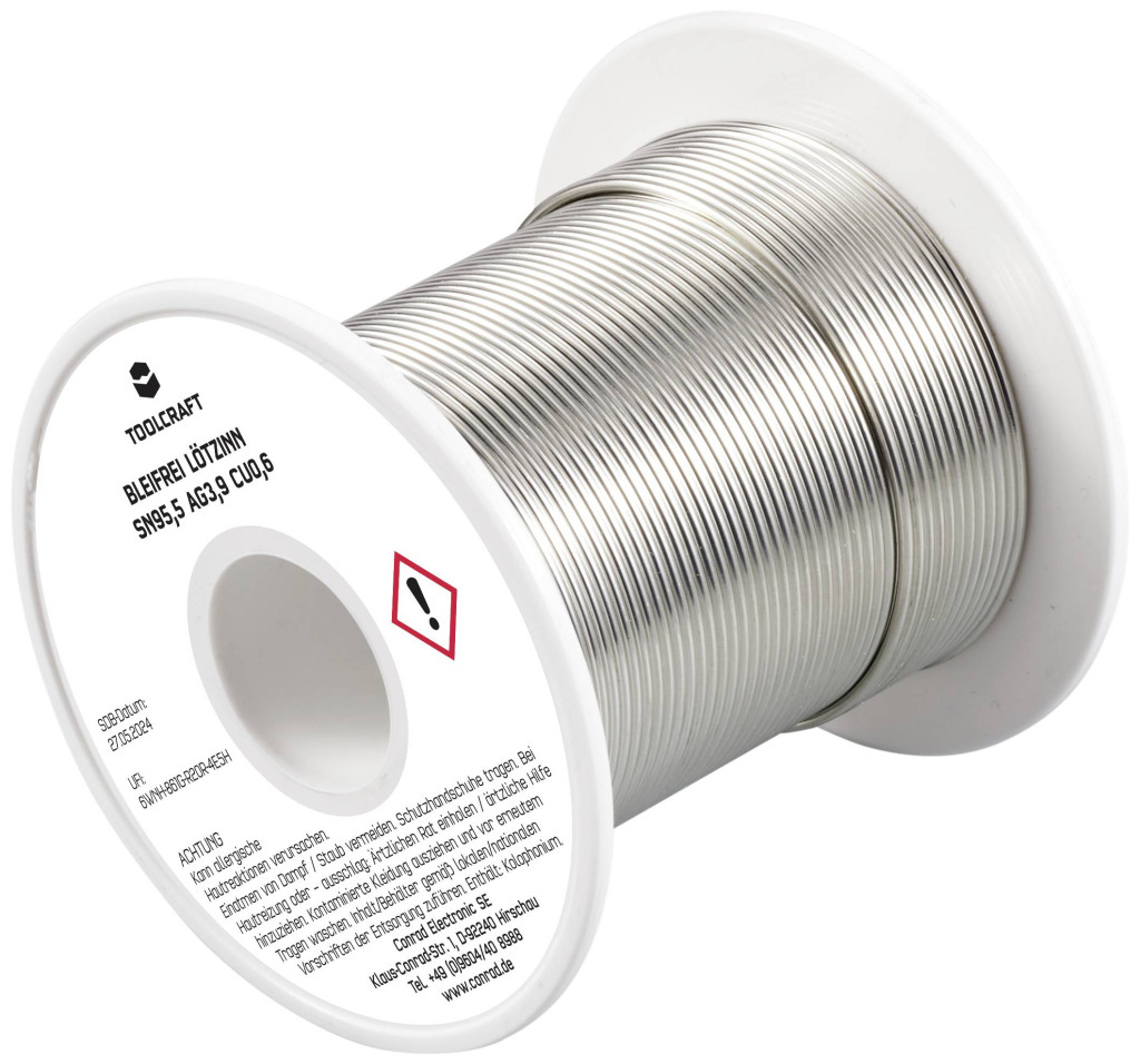Műszaki adatok: Biztonsági tudnivalók / H mondatok: H 317: Allergiás bőrreakciót válthat ki. · Biztonsági tudnivalók / P mondatok: P 261: Kerülje a por/füst/gáz/köd/gőzök/permet belélegzését., P 280: Védőkesztyű/védőruha/szemvédő/arcvédő használata kötelező., P 333+313: Bőrirritáció vagy kiütések megjelenése esetén: Orvosi ellátást kell kérni., P 362+364: A szennyezett ruhát le kell vetni és az újbóli használat előtt ki kell mosni., P 501: A tartalom/edény elhelyezése hulladékként: … · Biztonsági tudnivalók, GHS: GHS07: Irritáló · Folyasztószer típus: ROL1 · Huzal átmérő: 1.2 mm · Jelölő szó (veszélyes anyag): Figyelem · Kivitel (forrasztóón): Tekercs · Műanyagmentes csomagolás: Műanyagmentes csomagolás · Súly: 100 g · Ötvözet: Sn95,5Ag3,9Cu0,6