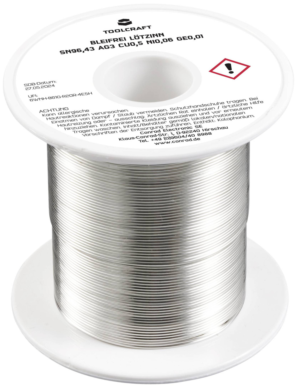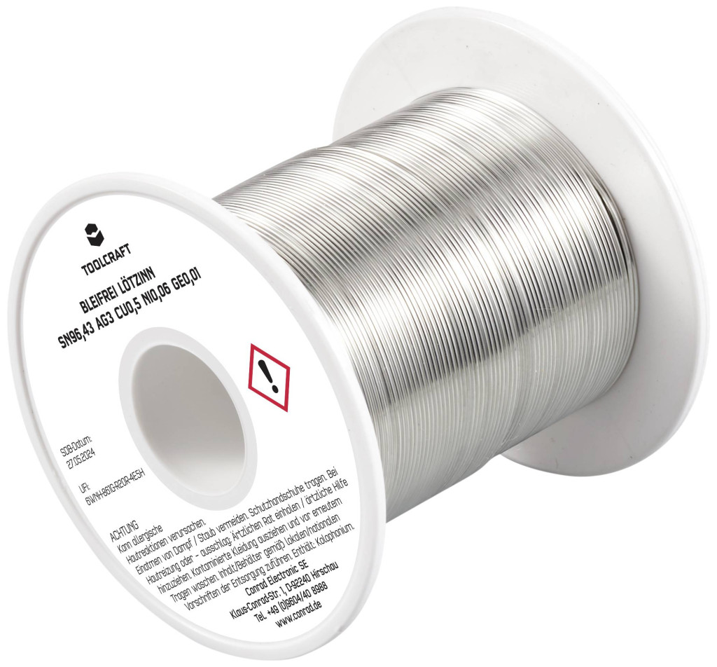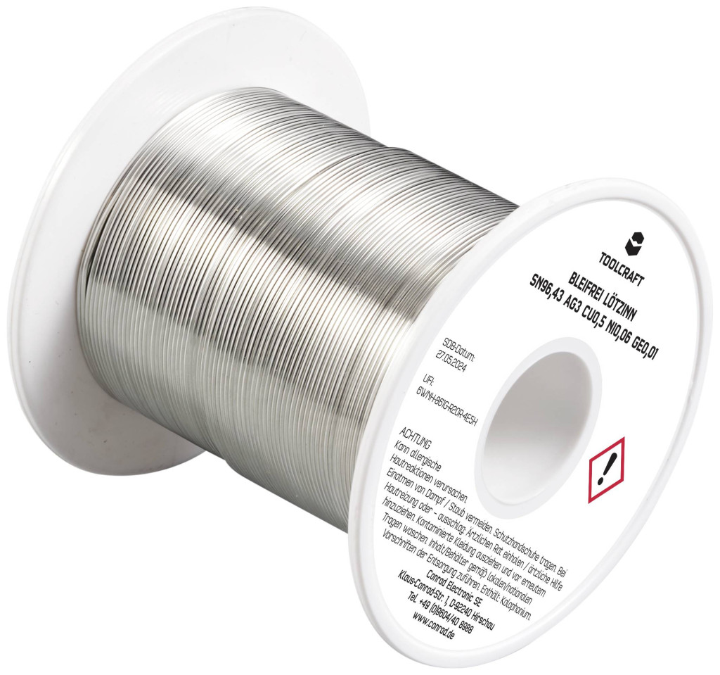 Műszaki adatok: Biztonsági tudnivalók / H mondatok: H 317: Allergiás bőrreakciót válthat ki. · Biztonsági tudnivalók / P mondatok: P 261: Kerülje a por/füst/gáz/köd/gőzök/permet belélegzését., P 280: Védőkesztyű/védőruha/szemvédő/arcvédő használata kötelező., P 333+313: Bőrirritáció vagy kiütések megjelenése esetén: Orvosi ellátást kell kérni., P 362+364: A szennyezett ruhát le kell vetni és az újbóli használat előtt ki kell mosni., P 501: A tartalom/edény elhelyezése hulladékként: … · Biztonsági tudnivalók, GHS: GHS07: Irritáló · Folyasztószer típus: ROL1 · Huzal átmérő: 0.7 mm · Jelölő szó (veszélyes anyag): Figyelem · Kivitel (forrasztóón): Tekercs · Műanyagmentes csomagolás: Műanyagmentes csomagolás · Súly: 100 g · Ötvözet: Sn96,43Ag3Cu0,5Ni0,06Ge0,01