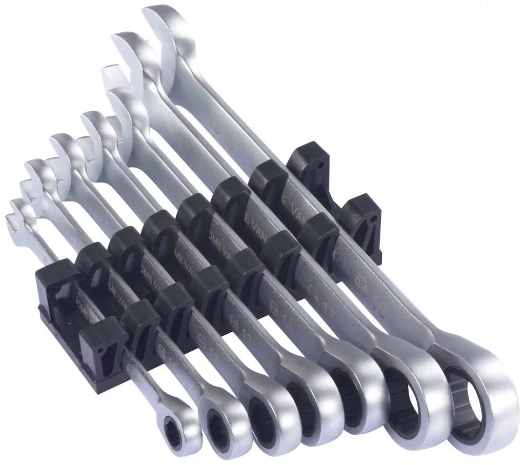 A 7 részes Toolcraft nyitott végű/racsnis kulcs készlet (hüvelyk/metrikus) csúszásmentes racsnis profillal megvédi a csavarokat a sérülésektől. A kulcsok kompatibilisek az angolszász/metrikus csavarokkal. A kulcsok tárolására szolgáló fali tartó jár hozzá.