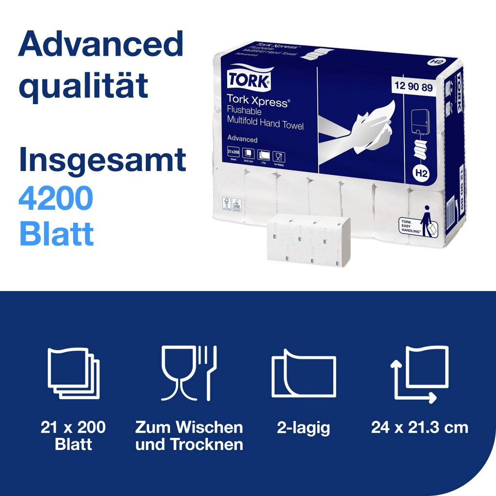 Technical specifications: Alkalmas: Tork H2 · Anyag: #####Frischzellstoff · Hajtás típus: Többszörös Z · Méret, hossz: 24 cm · Méret, szélesség: 21.3 cm · Rétegek száma: 2 lagig · Szállítási forma: Műanyag · Szín: Fehér