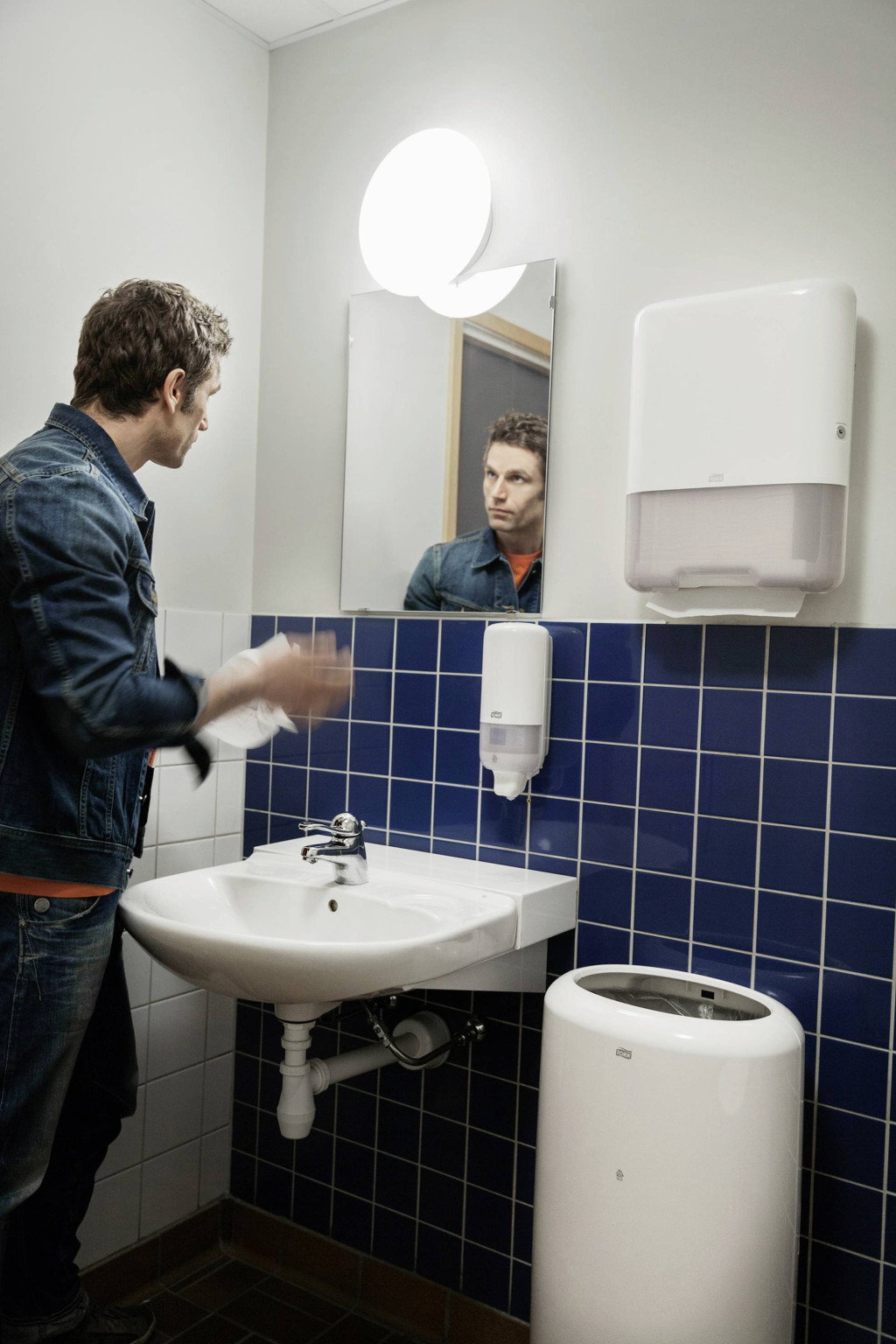 A kompakt papírtörölköző-adagoló kezdőkészletként 1 köteg puha cikk-cakk papírtörlőt tartalmaz. Kis és közepes forgalmú mosdókhoz. Higiénikus és gazdaságos az egyedi törülköző eltávolításnak köszönhetően.