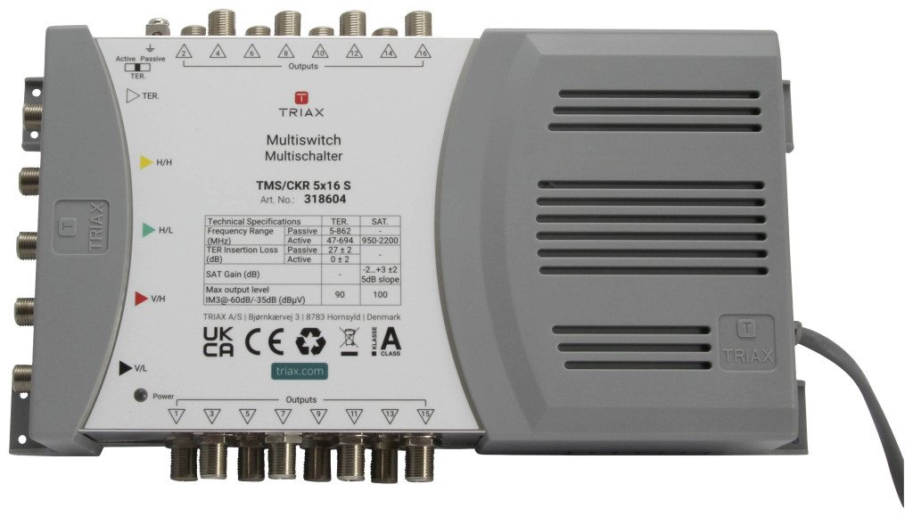 Egyetlen multiswitch 1 műholdpozícióhoz 5 bemenettel és 16 kimenettel, alkalmas műholdas és földi jelek elosztására kis és közepes méretű berendezésekben.