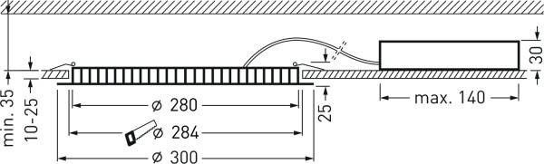 Műszaki adatok: 2021-es energiahatékonysági osztályok: n.rel. · Anyag: Alumínium · Beépítési mélység: 30 mm · Beépítési átmérő: 280 mm · Foglalat: Nélkül · Fényforrás típus: LED · Fényforrások száma: 1 · Fényforrással: Igen · Fényszín: 3000 K · Fényszín (fényforrás): Fehér · Fényáram összesen: 2550 lm · Gyártói szín: Fehér · Helyiség: Nappali/étkező, Hálószoba, Konyha · Külső átmérő: 300 mm · Lámpa jellemzők: A mennyezetre történő szerelés lehetséges, Beépített világításként használható, Dimmelhető · Méret, hossz: 300 mm · Méret, magasság: 30 mm · Méret, szélesség: 300 mm · Stílus: Modern/dizájn · Sugárzási szög: 80 ° · Teljesítmény: 30 W · Védelmi osztály: II · Védelmi típus: IP20 · Üzemi feszültség: 220 V, 240 V