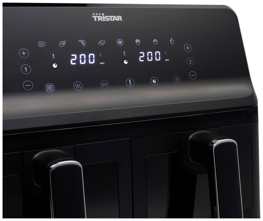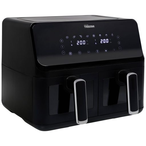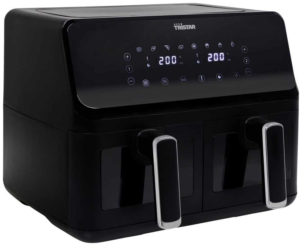 Ezzel a duplakosaras légsütővel két ételt készíthet egyszerre. Teljes térfogata 8 liter, teljesítménye 2700 W és szinkron befejező funkciója van. Az egész vacsorád egy mozdulattal elkészül!