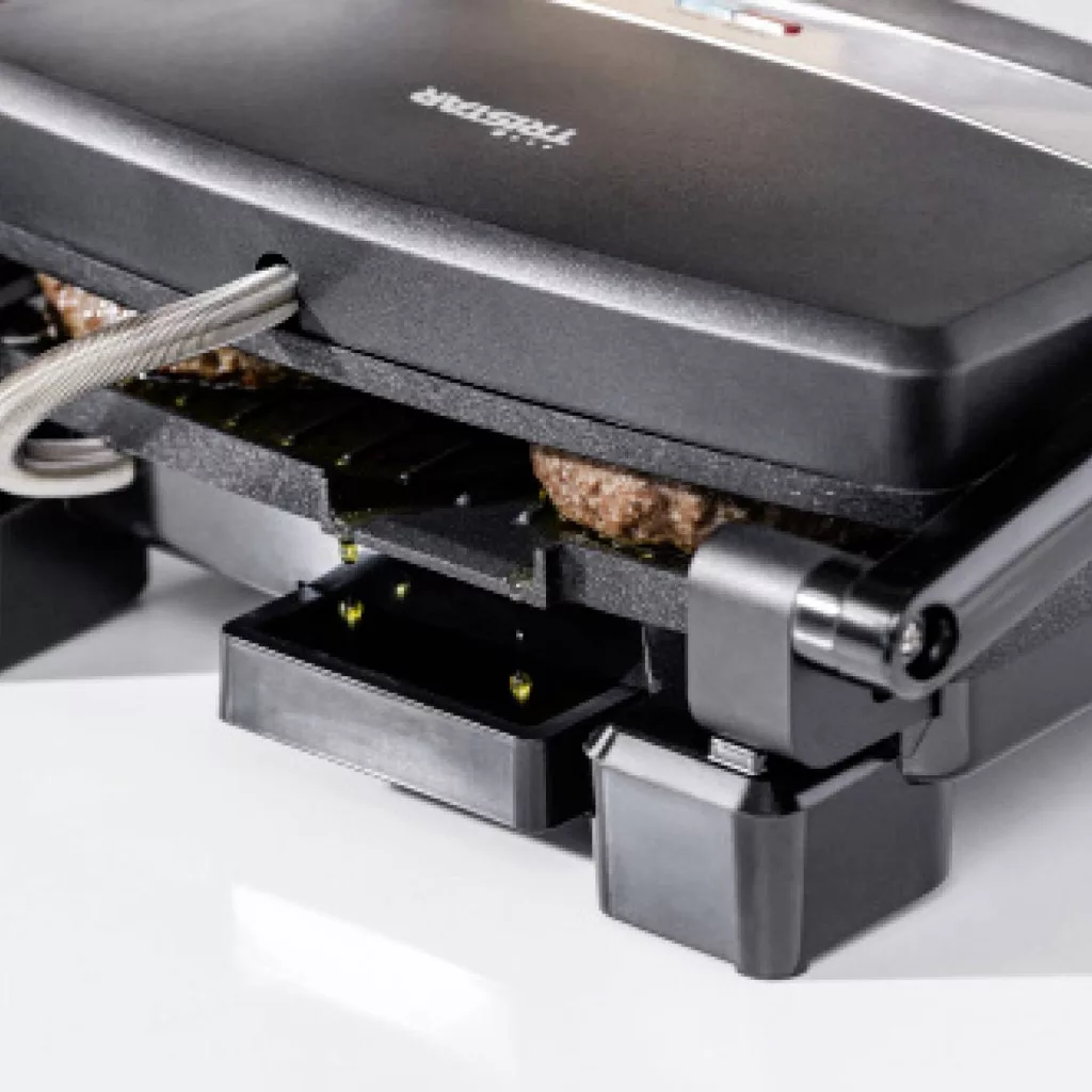 Kontaktgrill erős tapadásmentes bevonattalA Tristar Contact Grill kiváló minőségű tapadásmentes bevonattal rendelkezik, hogy bármi ne tapadjon a grilllemezekre. A vaj vagy az olaj használata nem szükséges, ami azt jelenti, hogy különösen egészséges ételeket készíthet. Könnyedén megtisztíthatja az érintkezőrácsot is, ha ruhával megtörli. A zsírt egy csepegtető tálcába gyűjtik a könnyű tisztítás és az egészséges grillezés érdekében.