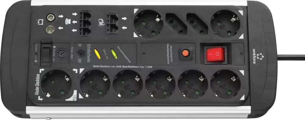 Műszaki adatok: Alkalmas: DVB-C, kábel (koax),Hálózat (RJ45),Tel/Fax (RJ11) · Alkalmazási terület: Beltér · Anyag: Alumínium · Bekapcsolási küszöb: 8 - 80 W · Csatlakozási teljesítmény: Mester: 550 W, slave: 1700 W (összes) · Dugaljak száma: 10 · Gyermekvédelem: Igen · Hálózati elosztó jellemzők: Túlfeszültség elleni védelem,Master-Slave funkció,Kapcsolóval,Gyermekvédelem · Kábel típus DIN/VDE szerint: H05VV-F 3G 1,5 mm² · Kábelhossz: 1.50 m · Levezető áram: 9 kA · Méret, hossz: 370 mm · Méret, magasság: 54 mm · Méret, szélesség: 157 mm · Működés jelző: Optikai · Szerelési mód: Nem · Szín: Fekete,Alumínium · Típus: Master-Slave elosztó · Üzemi feszültség: 230 V/AC