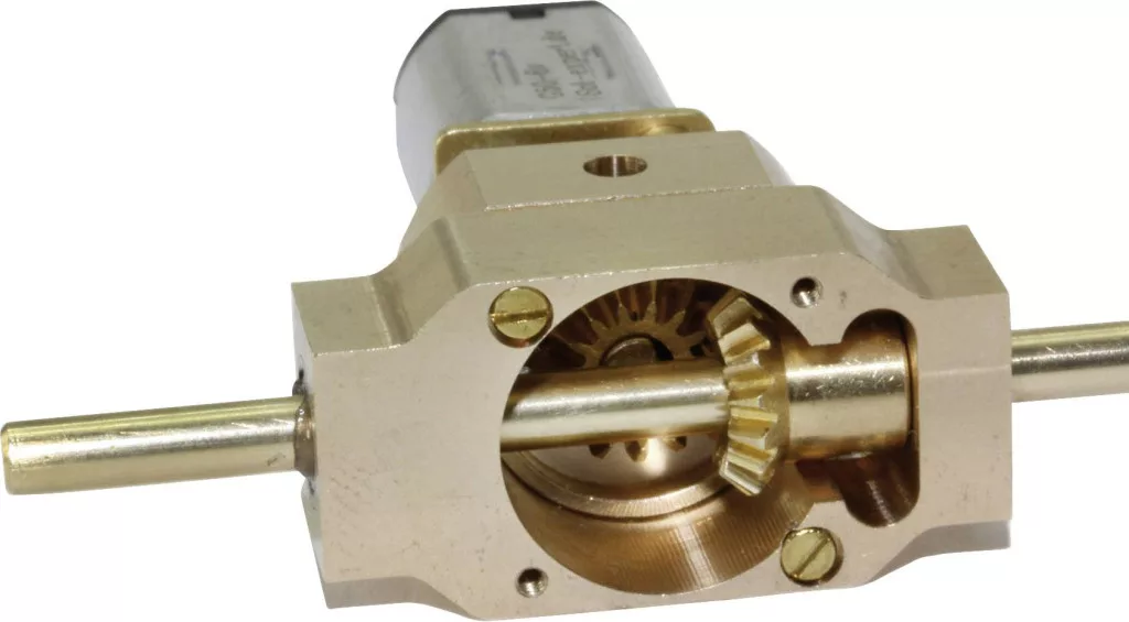 Kiegészítettük erőteljes G50 fém hajtóműves motorunkat robusztus, kúpos fogaskerék fokozattal. Ez a hajtás ezért tökéletesen használható 1:43 vagy nagyobb méretű járművekhez. A kimeneti tengely gömbcsapágy, a ház sárgarézből van marva. A teljes sebességváltó csavarozva van, ami megkönnyíti az összeszerelést és a karbantartást. A felszerelés fedelét karbantartás céljából még összeszerelés után is le lehet venni.