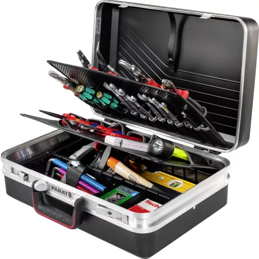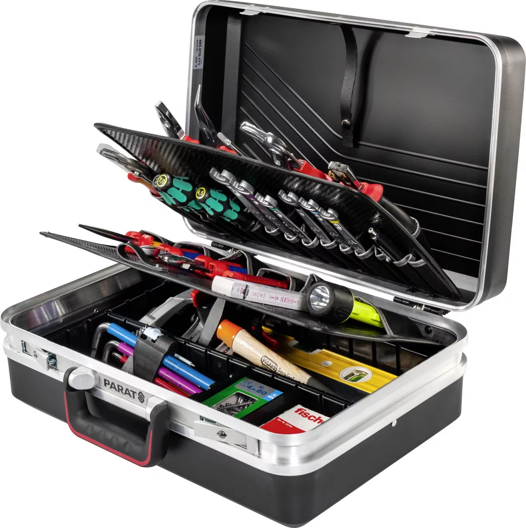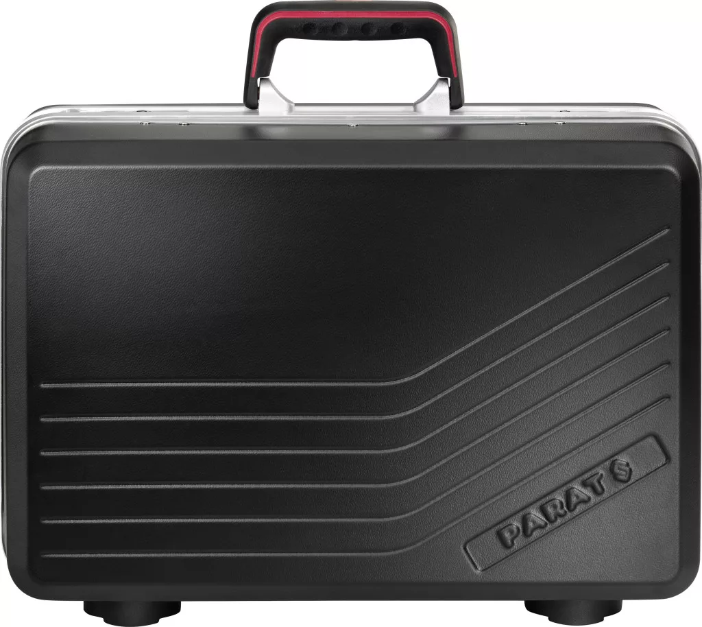 A Parat Twenty-One szerszámtok új dizájnnal, kifinomult és praktikus belső berendezéssel imponál. Összesen 27 kiváló minőségű varrott zsebbel rendelkezik egy kétoldalas szerszámlapon és egy fedőlapon, valamint külön befogható rekesszel a dokumentumok számára. A szerszámlapok stabil és rugalmas Con-Pearl®-ből készülnek, és biztonságos elfordítással vannak rögzítve. Ezenkívül a Parat Twenty-One szerszámtáskának van egy alsó tálcája, amely szabadon felosztható és 58 milliméter magas. Az eszközök mindig jól védettek a robusztus és tartós, ABS műanyagból készült héjak között, megújult kivitelben. Ezenkívül a tok fedelén található erős fémpántok biztosítja a biztonságos helyzetet nyitott állapotban is. A Parat Twenty-On stabil és ergonomikus formájú fogantyúval és biztonságos billenő hengerzáraival is lenyűgöz. Sok új eszköz szállítható egyszerűen és biztonságosan az új Parat Twenty-On-al.