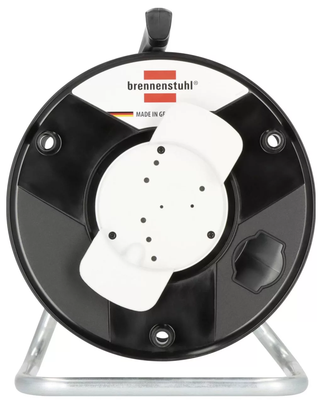 Equipment: A Brennenstuhl Garant üres fekete tárolódobja ideális a praktikus fel- és letekeréshez munka közben. A következő tulajdonságokkal is lenyűgöző: