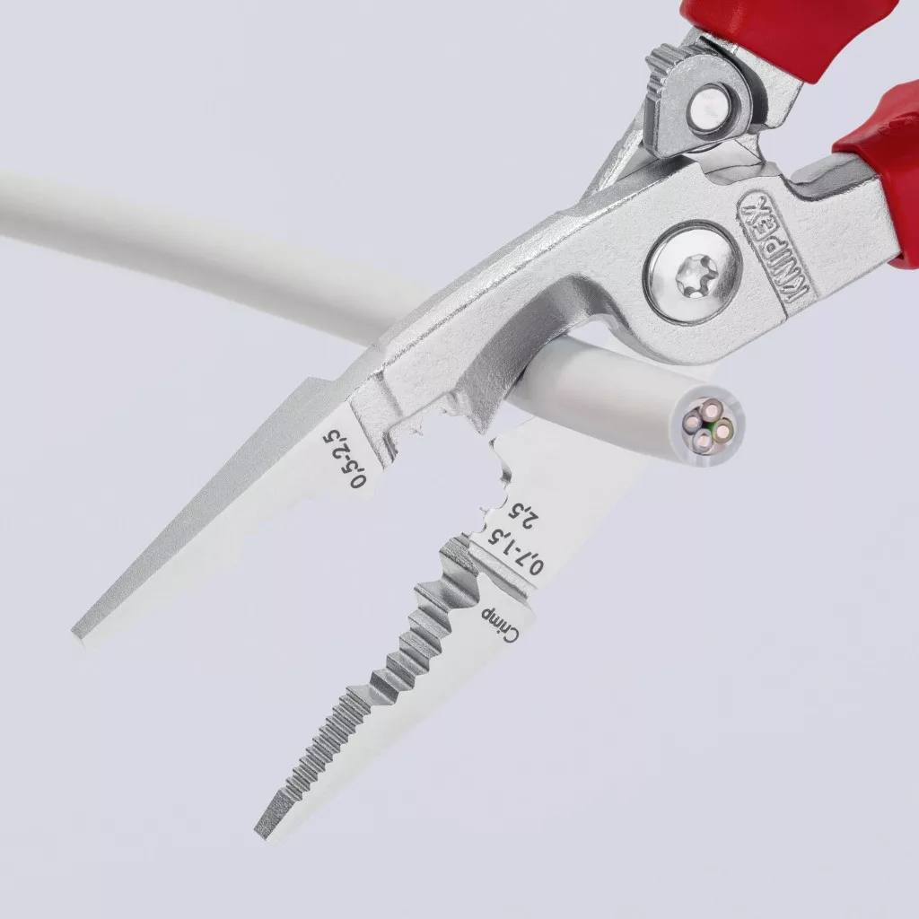 Jellemzők: Multifunkciós fogó elektromos szereléshez lapos- és kör keresztmetszetű anyagok megfogásához, hajlításához, sorjátlanításához, kábel vágáshoz, csupaszításhoz és kábelvég hüvelyek krimpeléséhez · Egy fogóban 6 funkció · A csúcsnál sima fogófelülettel az egyes erek sérülésmentes megfogására profilos fogófelület és csőfogó rész lapos és kör keresztmetszetű anyagok megfogására · Markáns külső élű pofával, falba süllyesztett dobozokon végzett munkákhoz és az átvezető furatok sorjátlanításához · Vezeték ér csupaszító furatok 75 - 1,5 mm² és 2,5 mm² · Érvéghüvely krimpelő fészek 0,5 - 2,5 mm² · Kábelvágó olló precíziós vágóéllel (indukciósan edzett éllel) Cu és Al kábelekhez 5 x 2,5 mm² / Ø 15 mm-ig · Megfogás, a fogó teljes felnyitása nélkül (intelligens zárvatartó mechanizmussal a nyitórugós verziónál). A vágóél zárva és védve marad · Karcsú kialakítás a jó hozzáféréshez · Csavarozott csukló: a fogó precíz játékmentes működéséhez · Kiváló minőségű speciális szerszámacél, kovácsolva, olajban edzve. · A működésbe hozott reteszelő kilincs a vágó éleket zárva tartja, míg a többi funkció fennmarad. · Az értelmes fogva tartó szerkezettel a fogó nyitása nélkül is lehet "fogva tartani". A vágóél zárva és védve marad.